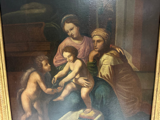 Olio su tavola. Sacra famiglia con Sant’Anna e San Giovannino . XVI secolo. 76 x 63