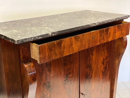 Elegant Empire style cupboard cabinet, first half of the 19th century, all veneered in mahogany feather, top in black Belgian marble, drawer under the top, two central doors, columns on the sides with braces, typical Empire front feet, three internal shelves