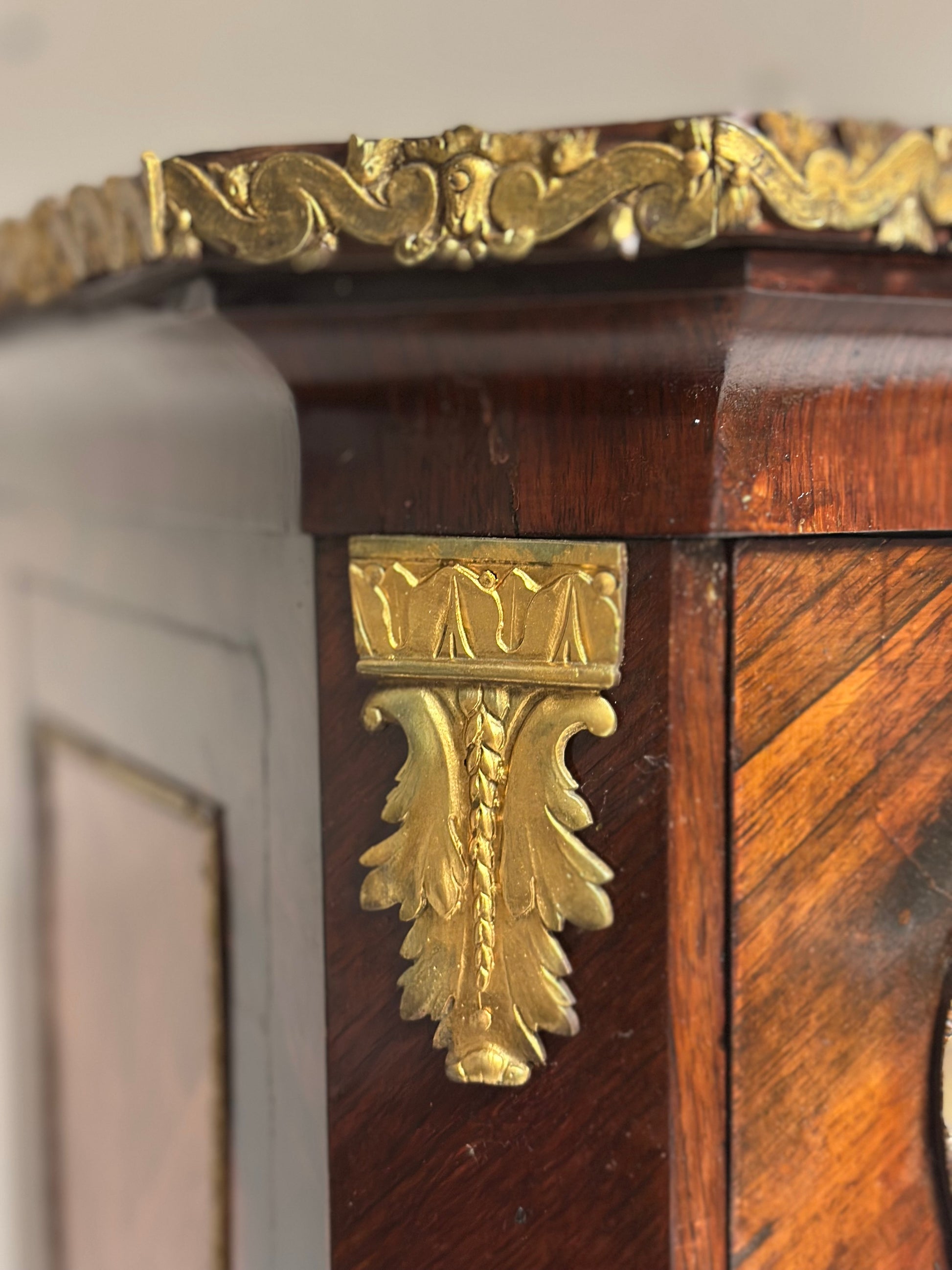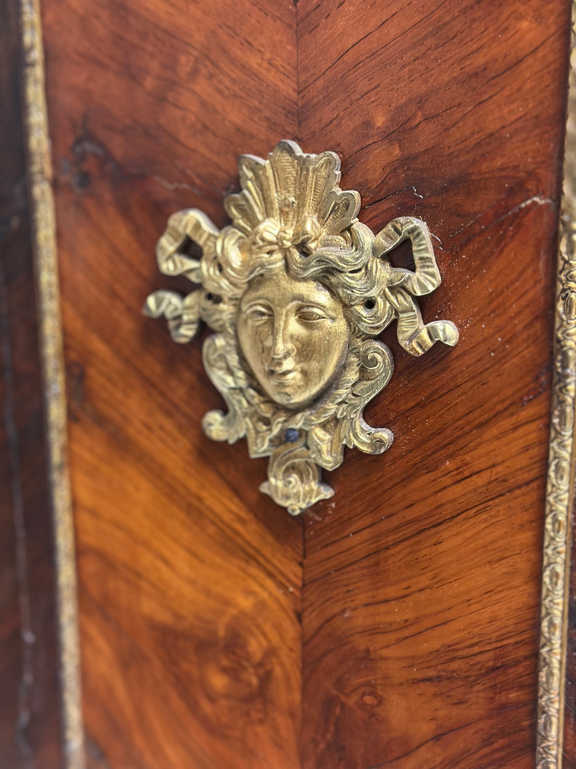 Questo tipo di mobile è caratterizzato da intarsi, impiallacciature in legni pregiati come palissandro e bois de rose, e ricche applicazioni in bronzo dorato . Restauro eseguito rivestita interamente di pregiato tessuto