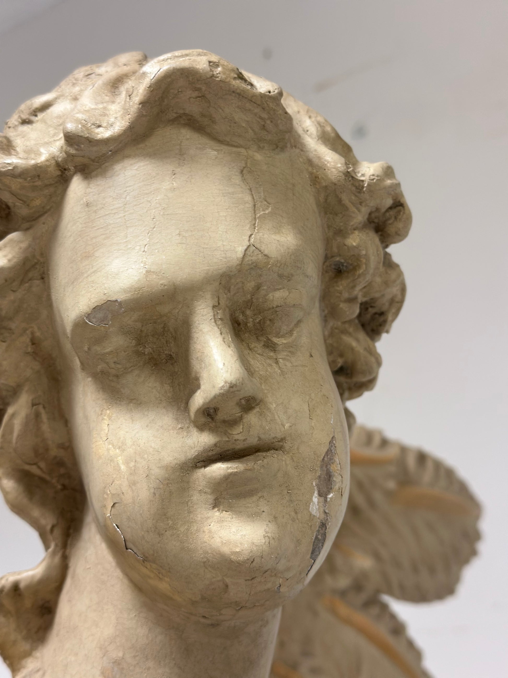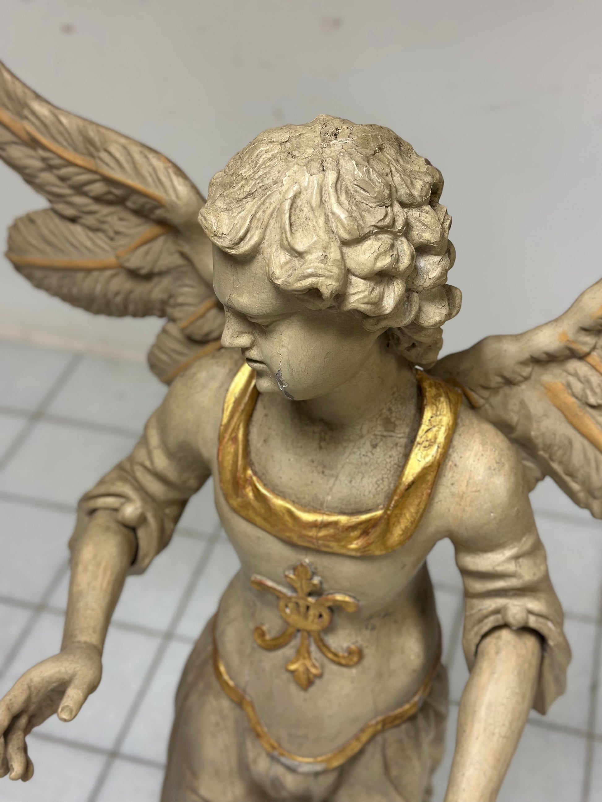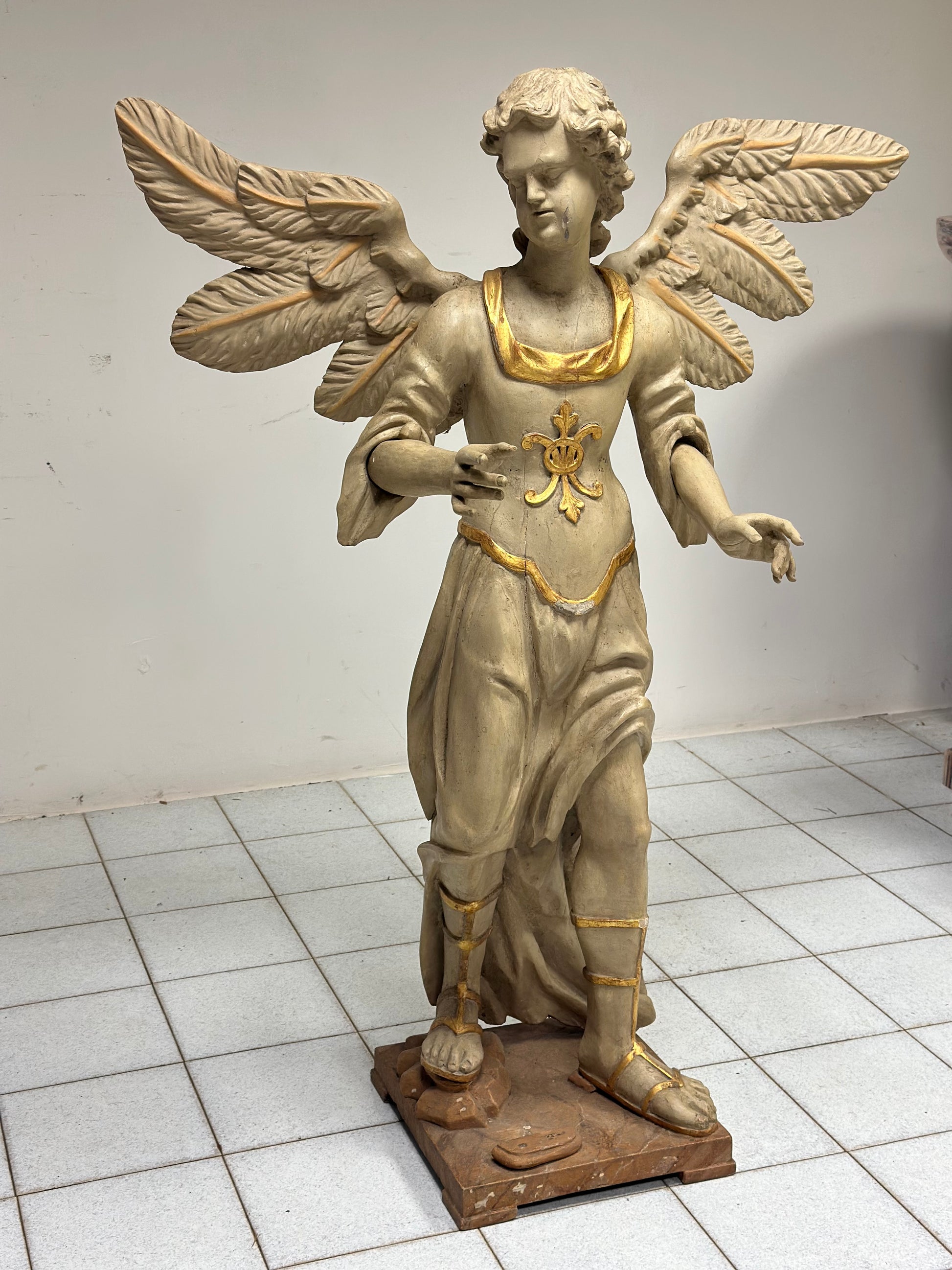 Scultura da terra a tutto tondo in legno intagliato e dorato epoca prima metà del’700 raffigurante un angelo alato di area toscana senese . Presenta panneggi gonfi e una veste che ricade sul corpo con un sandalo . Ottima fattura di esecuzione , sulla parte anteriore un decoro che ricorda il giglio