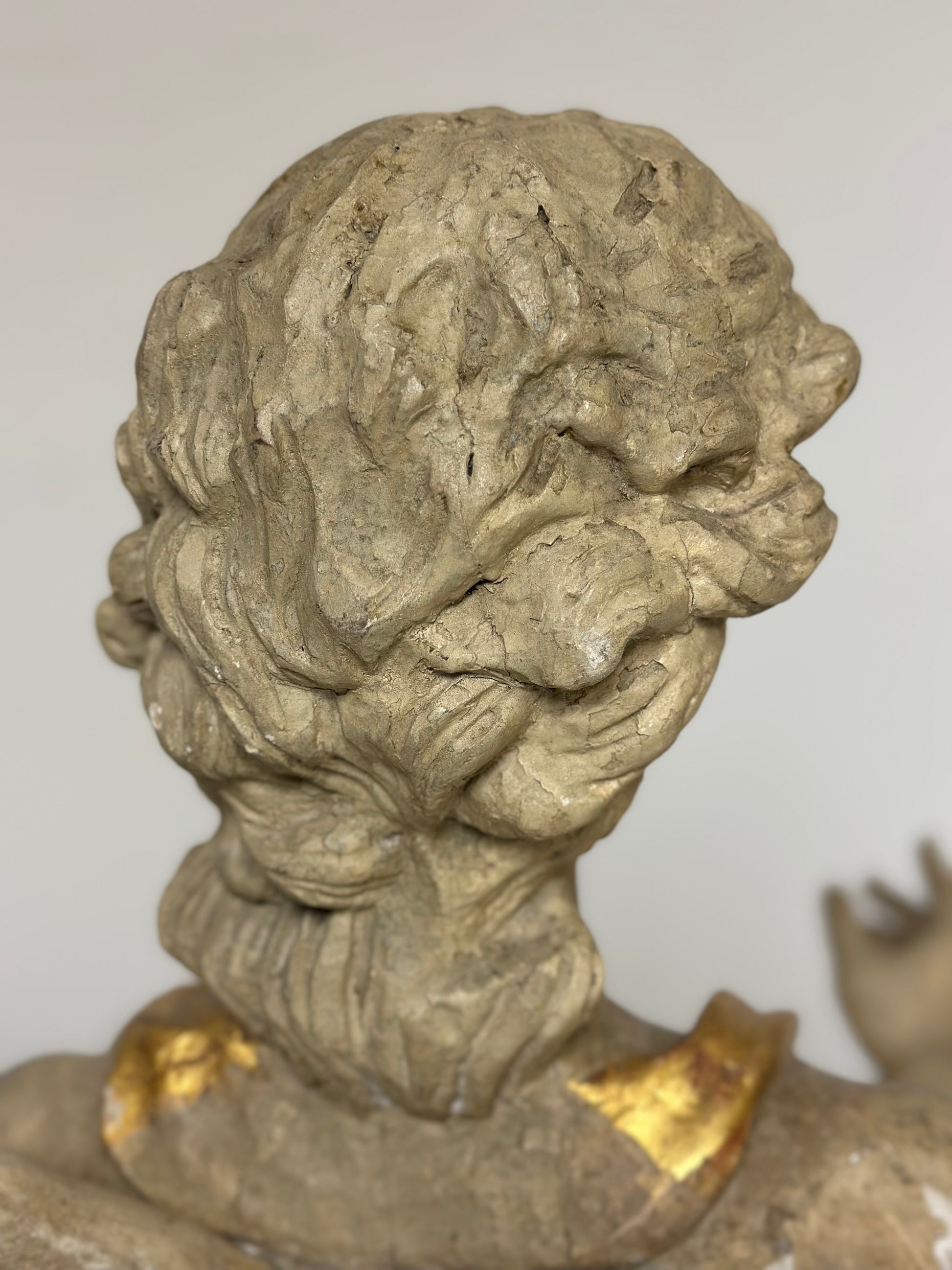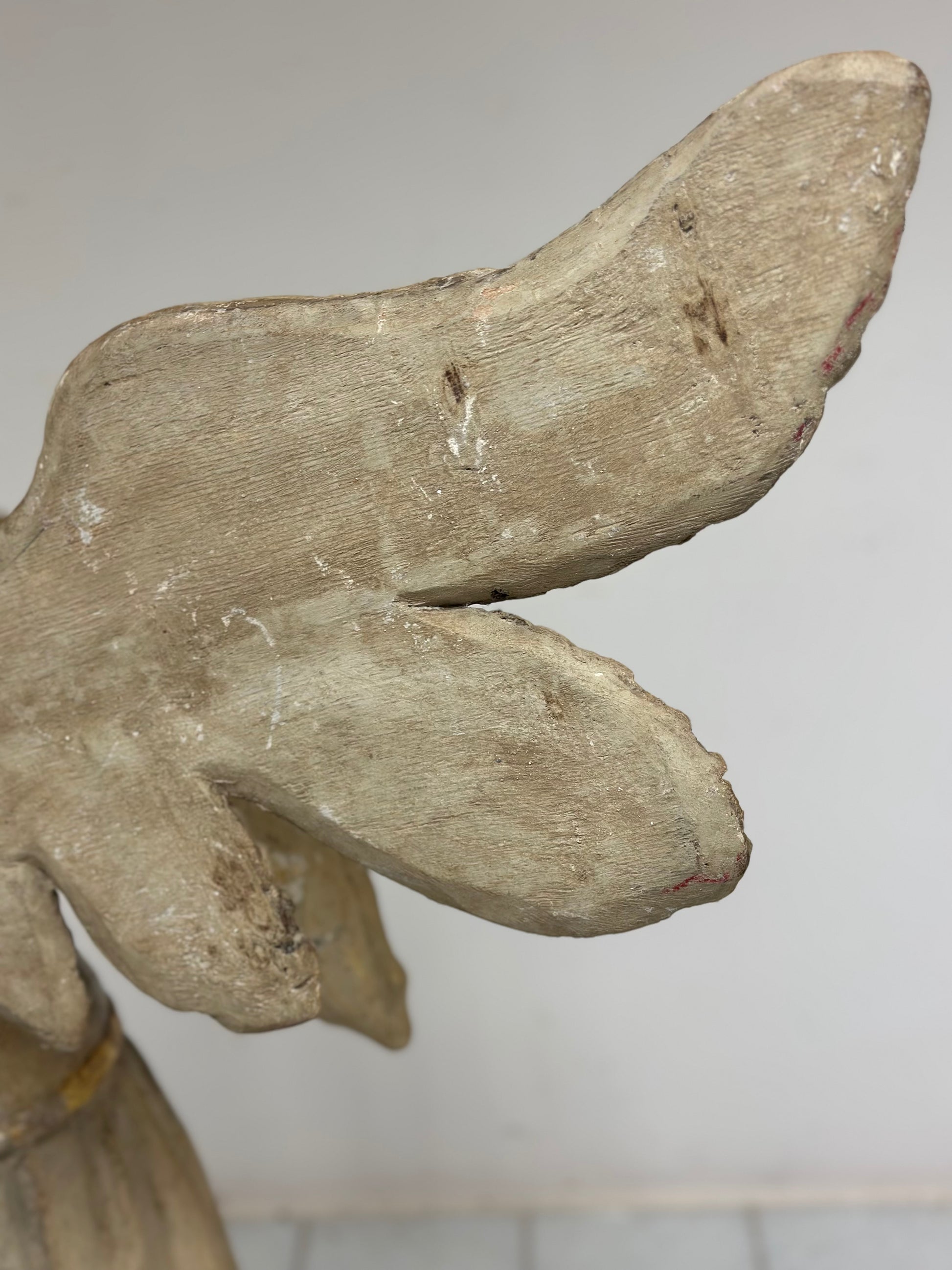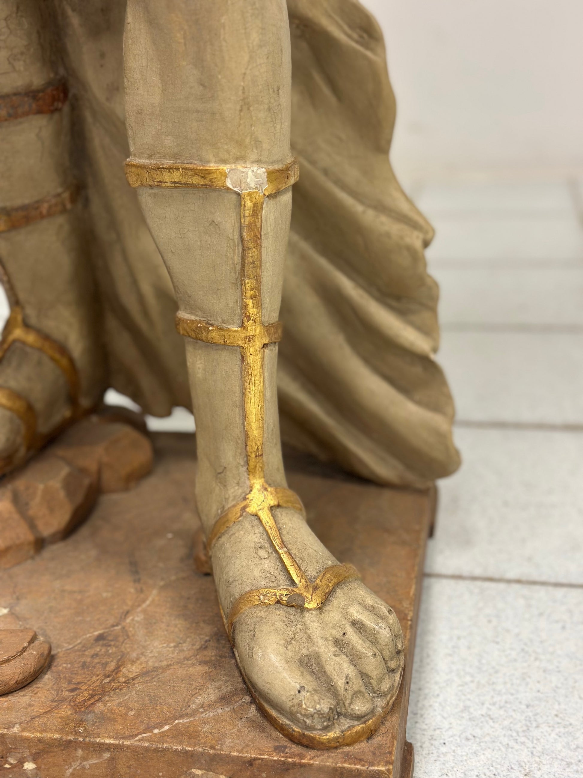 Scultura da terra a tutto tondo in legno intagliato e dorato epoca prima metà del’700 raffigurante un angelo alato di area toscana senese . Presenta panneggi gonfi e una veste che ricade sul corpo con un sandalo . Ottima fattura di esecuzione , sulla parte anteriore un decoro che ricorda il giglio