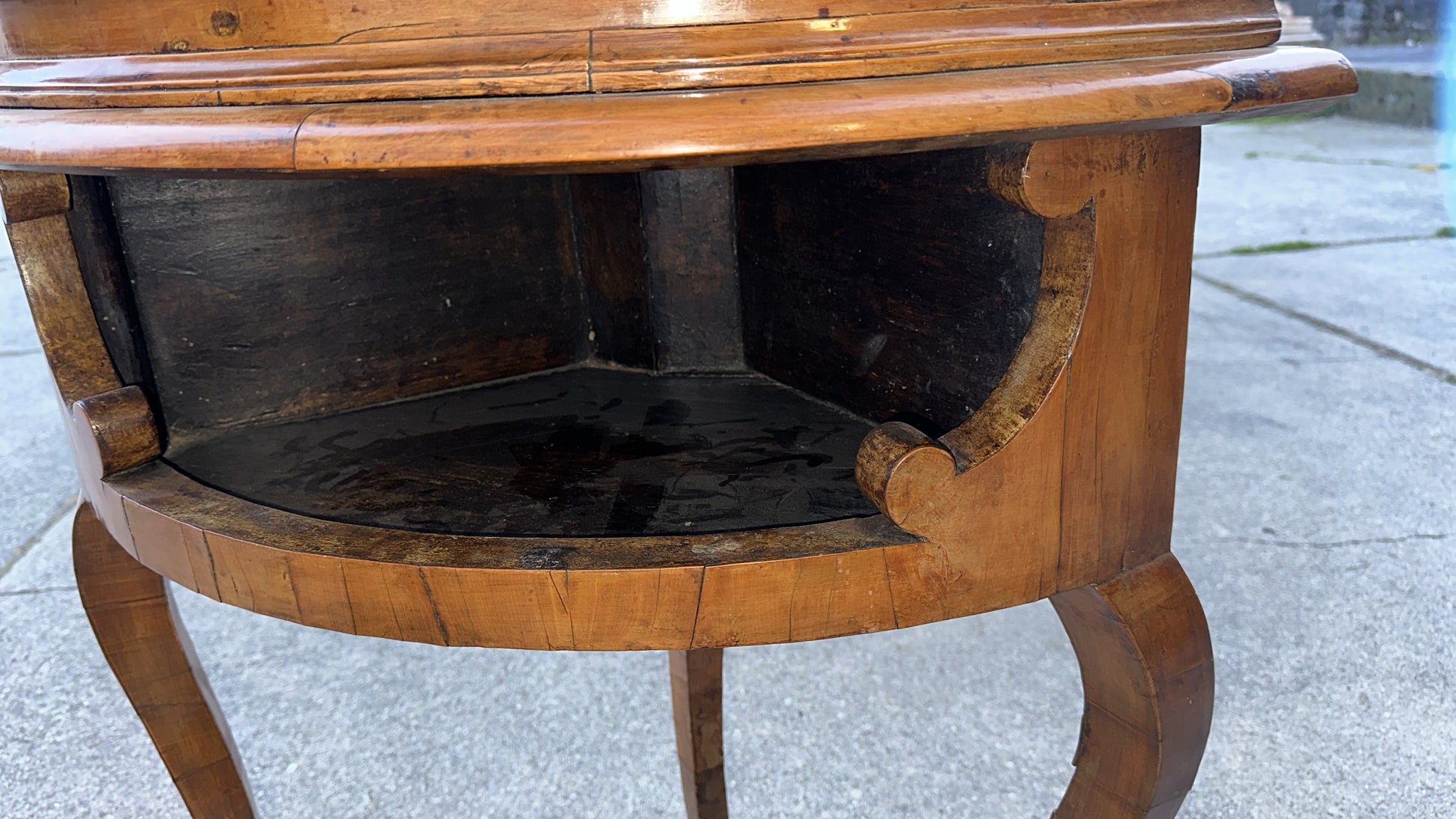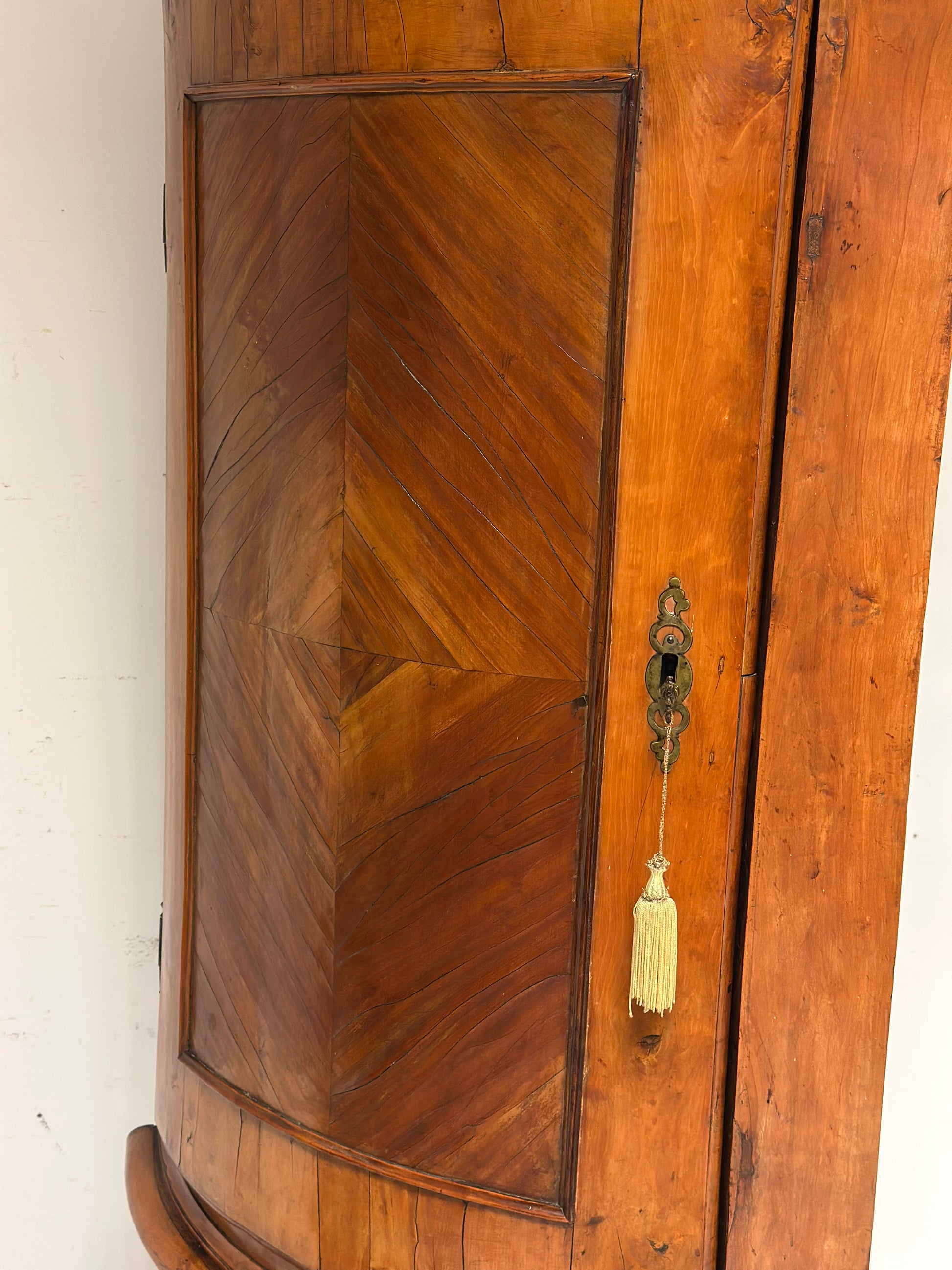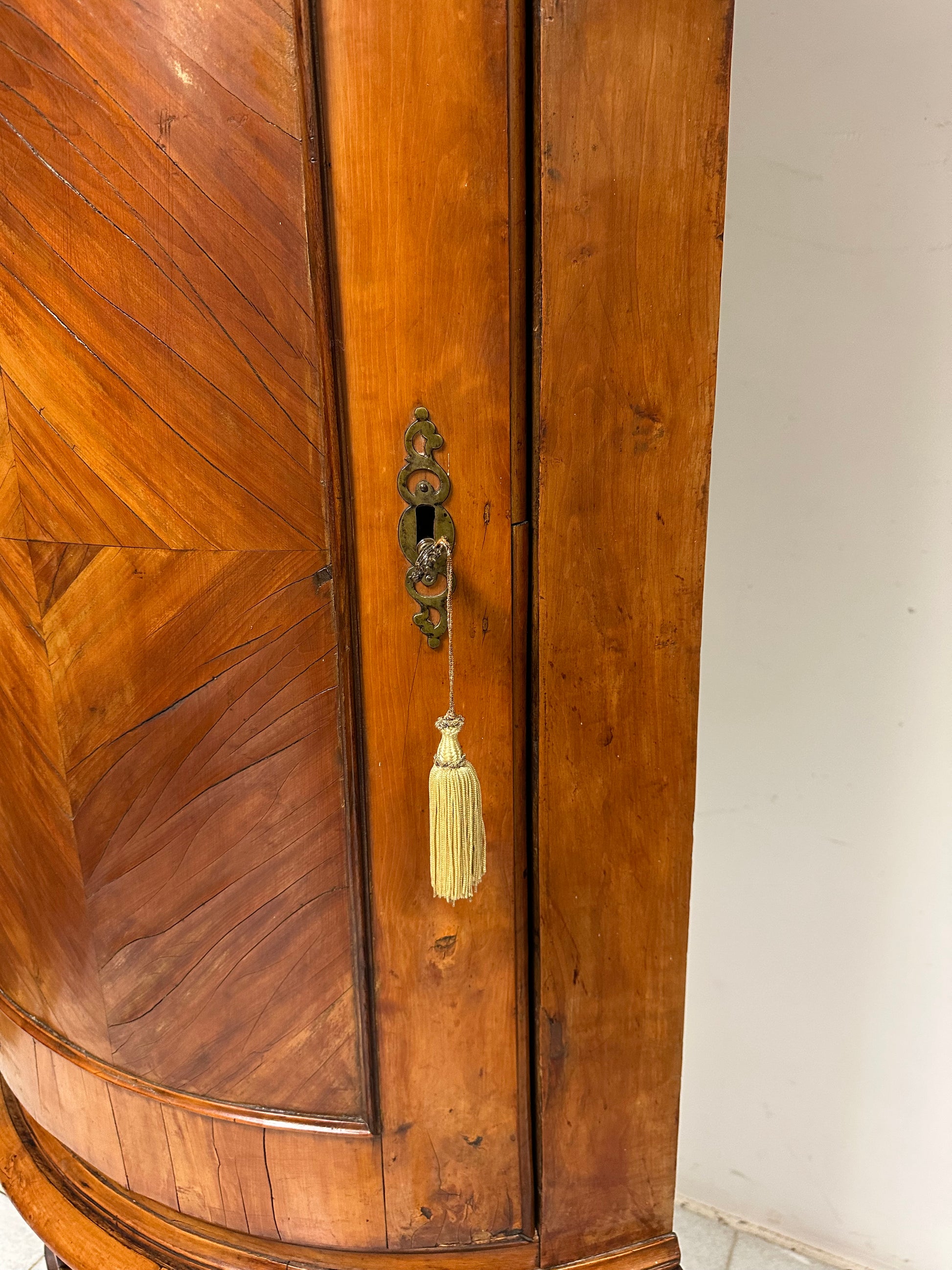 Angoliera Luigi XV epoca metà 700 bombata sul fronte con un vano a giorno sottoporta e uno sopra alla cimasa gambe arcuate sagomate tutta costruita in noce e lastra di noce. Presente serratura e chiave.