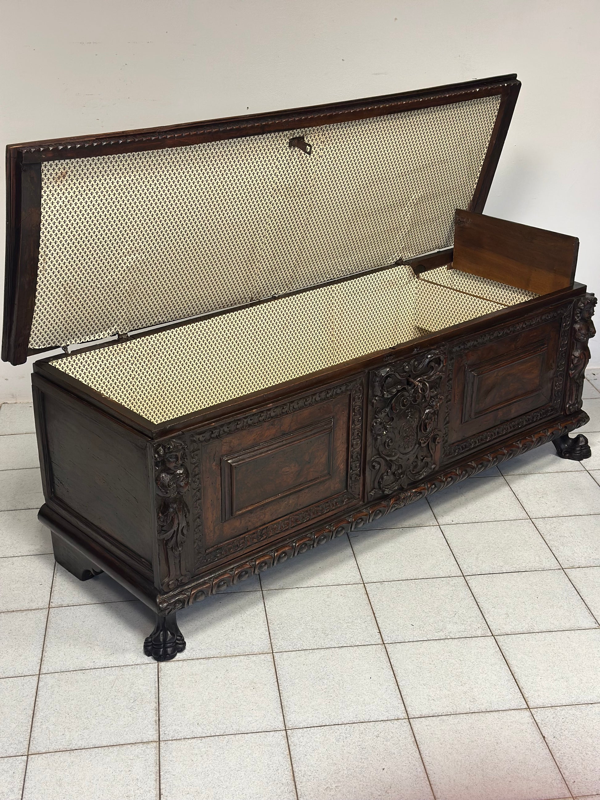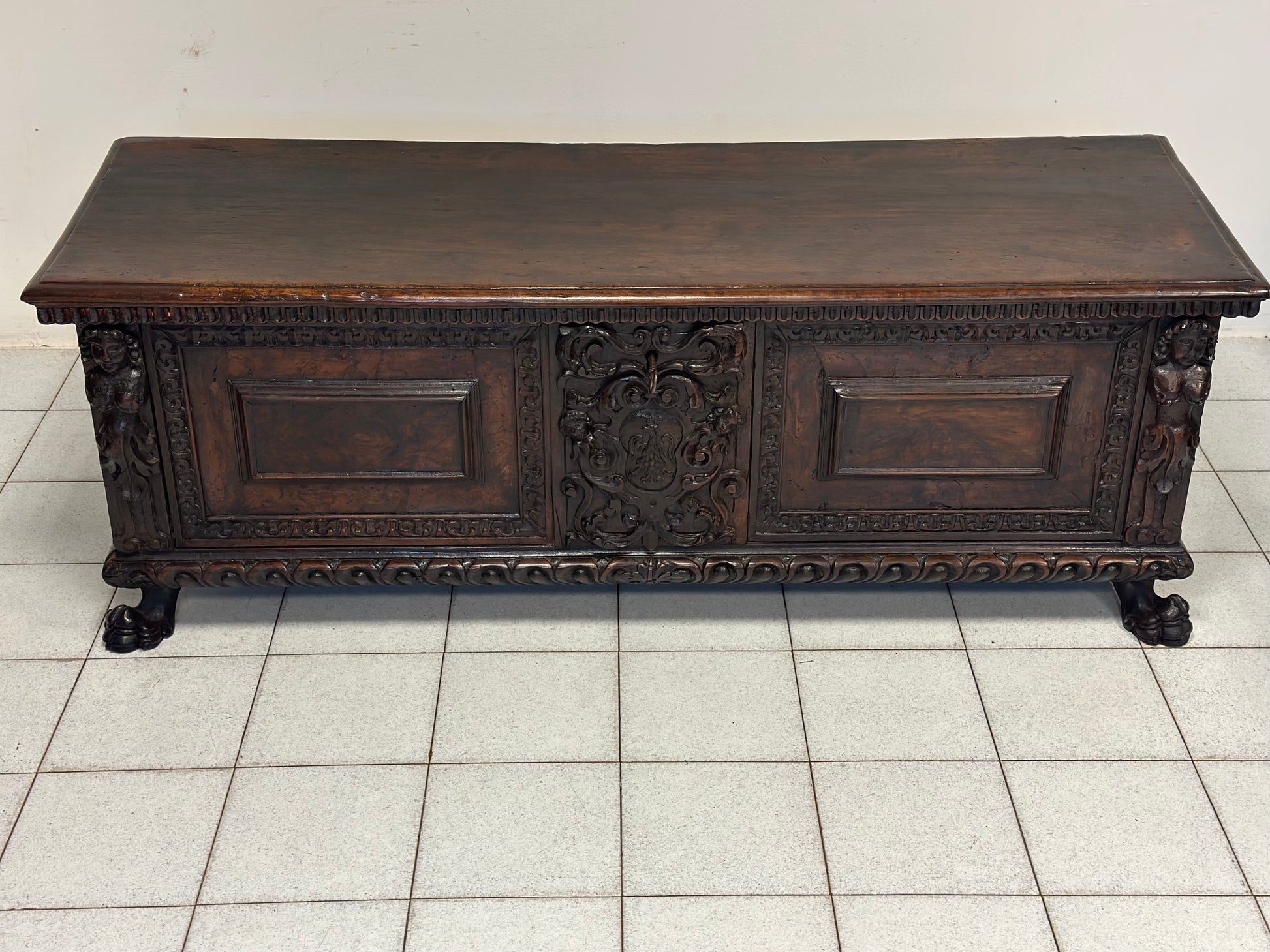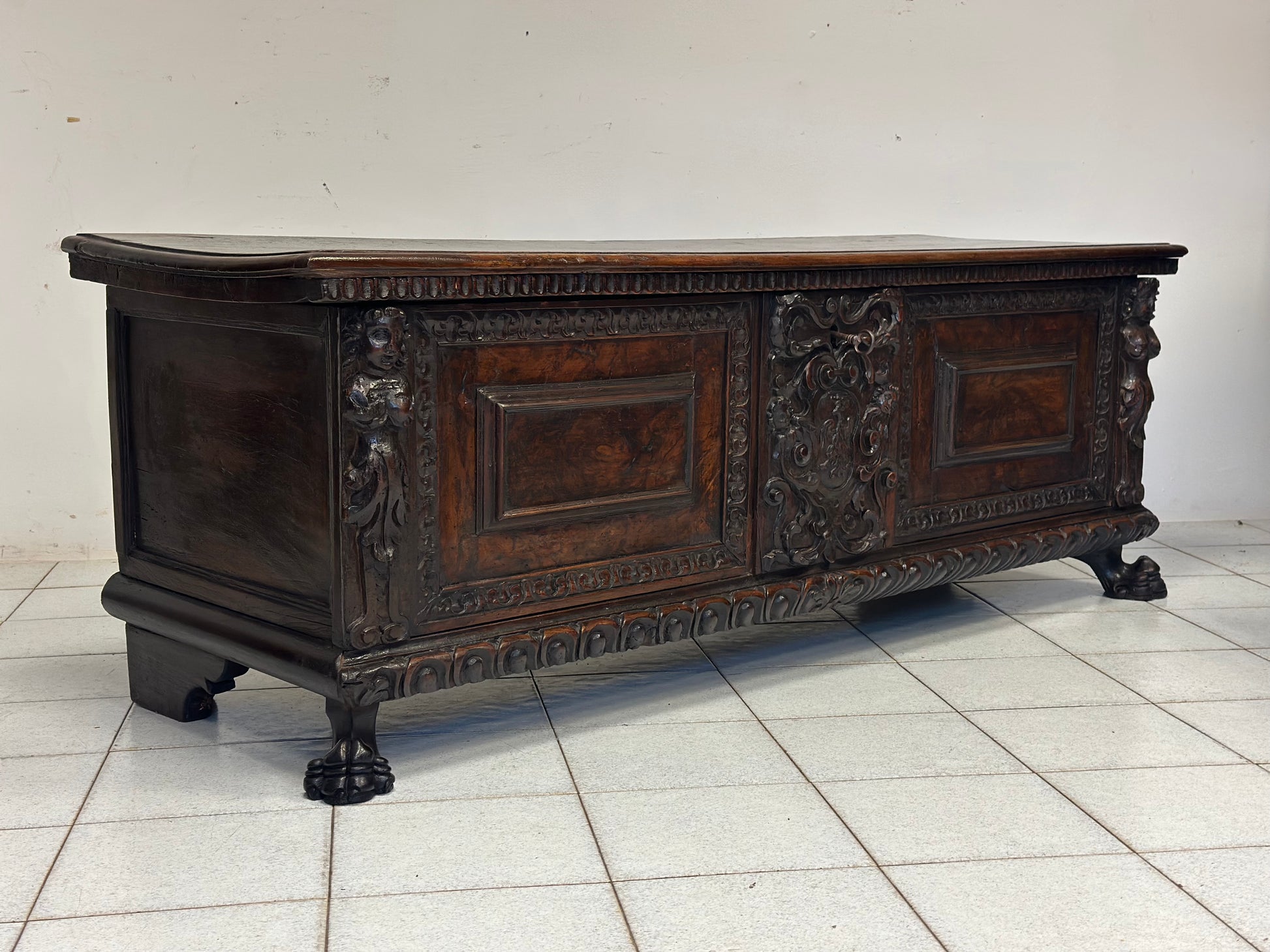 Importante cassapanca nobiliare rinascimentale epoca primi anni del 600 di zona lombarda esattamente città di Bergamo costruita rigorosamente tutta in noce fronte con specchiature in radica cariatidi scolpite sui montanti stemma nobiliare al centro intagliato base baccellata unghiata con piedi ferini