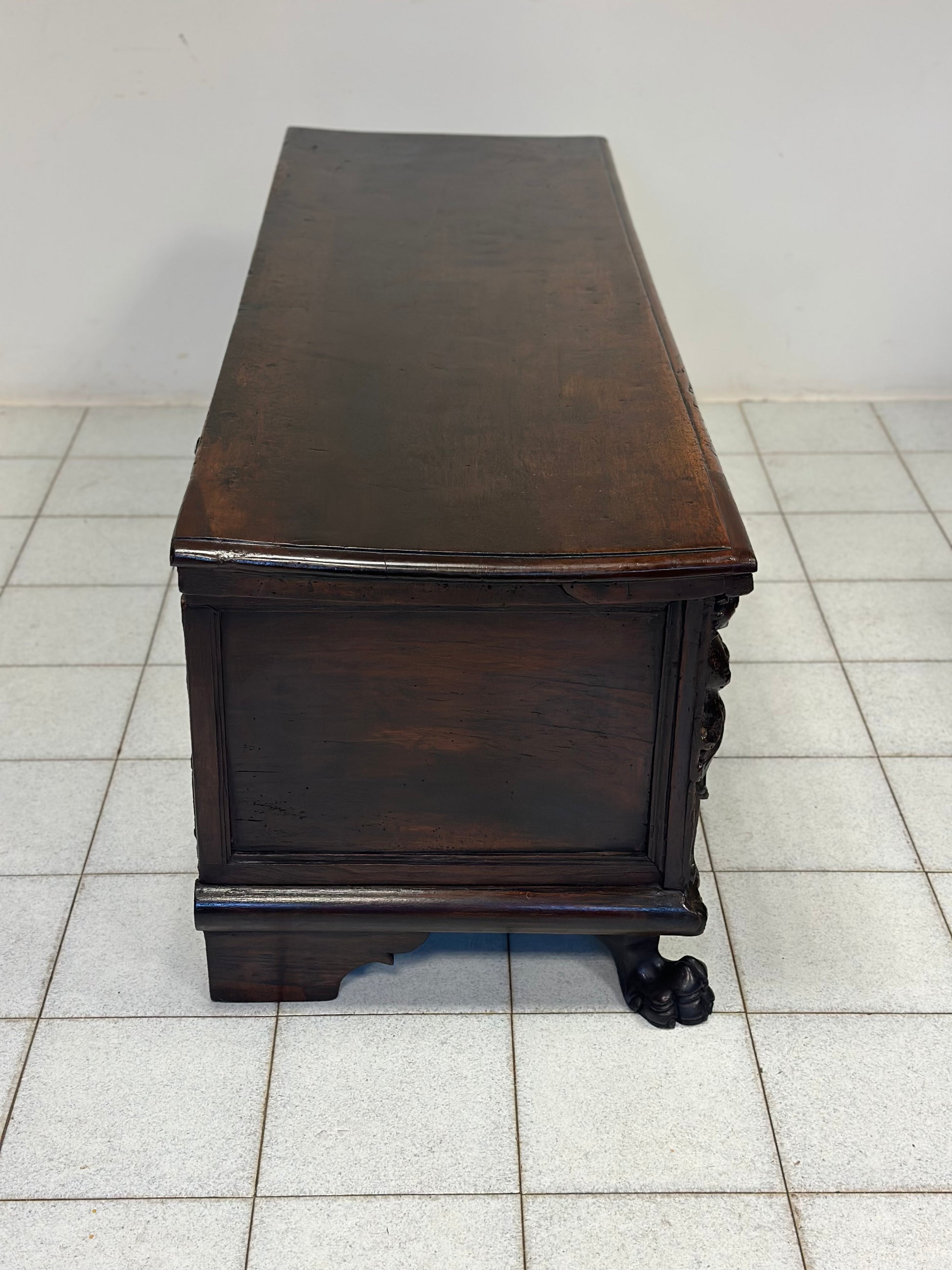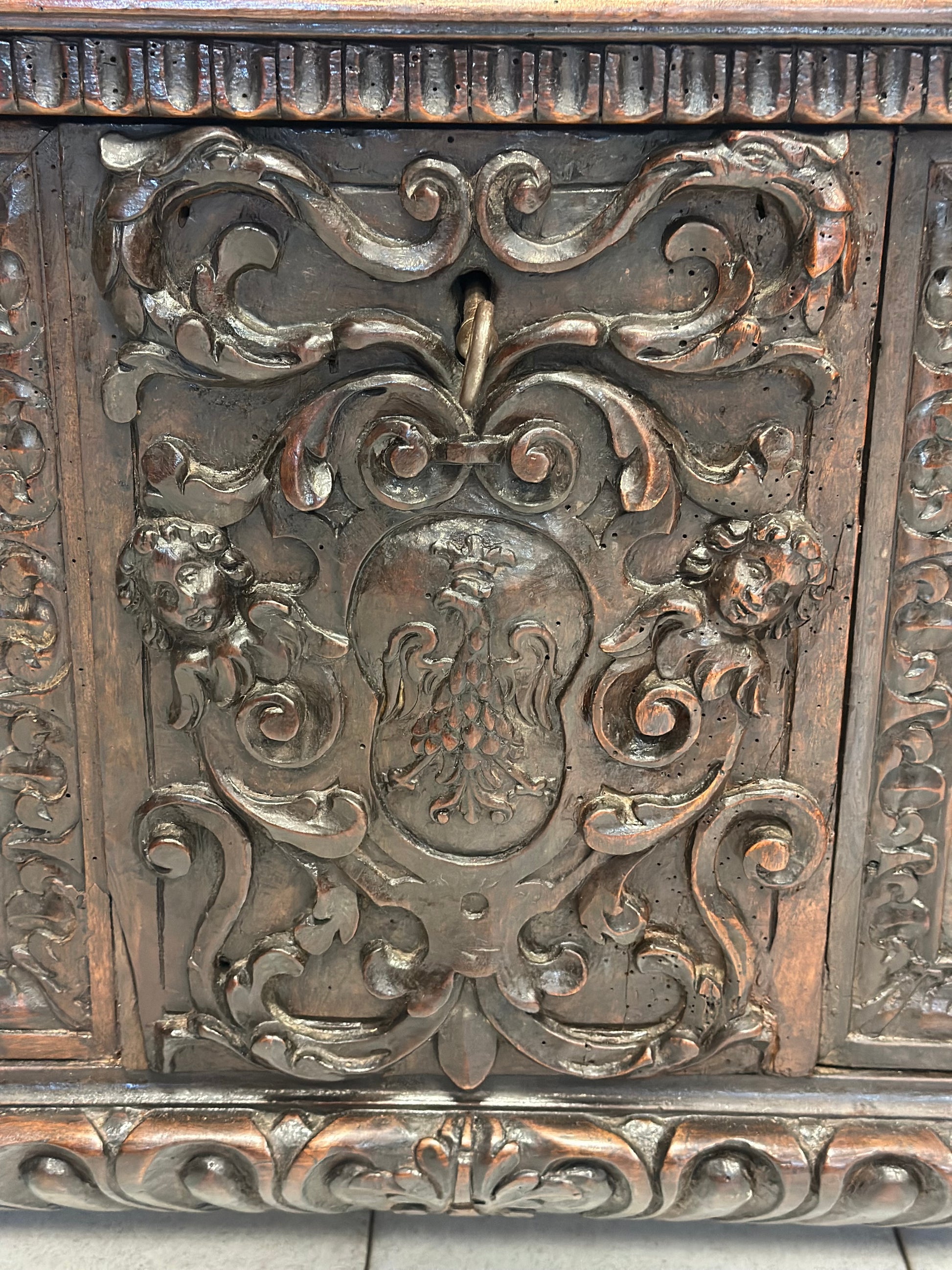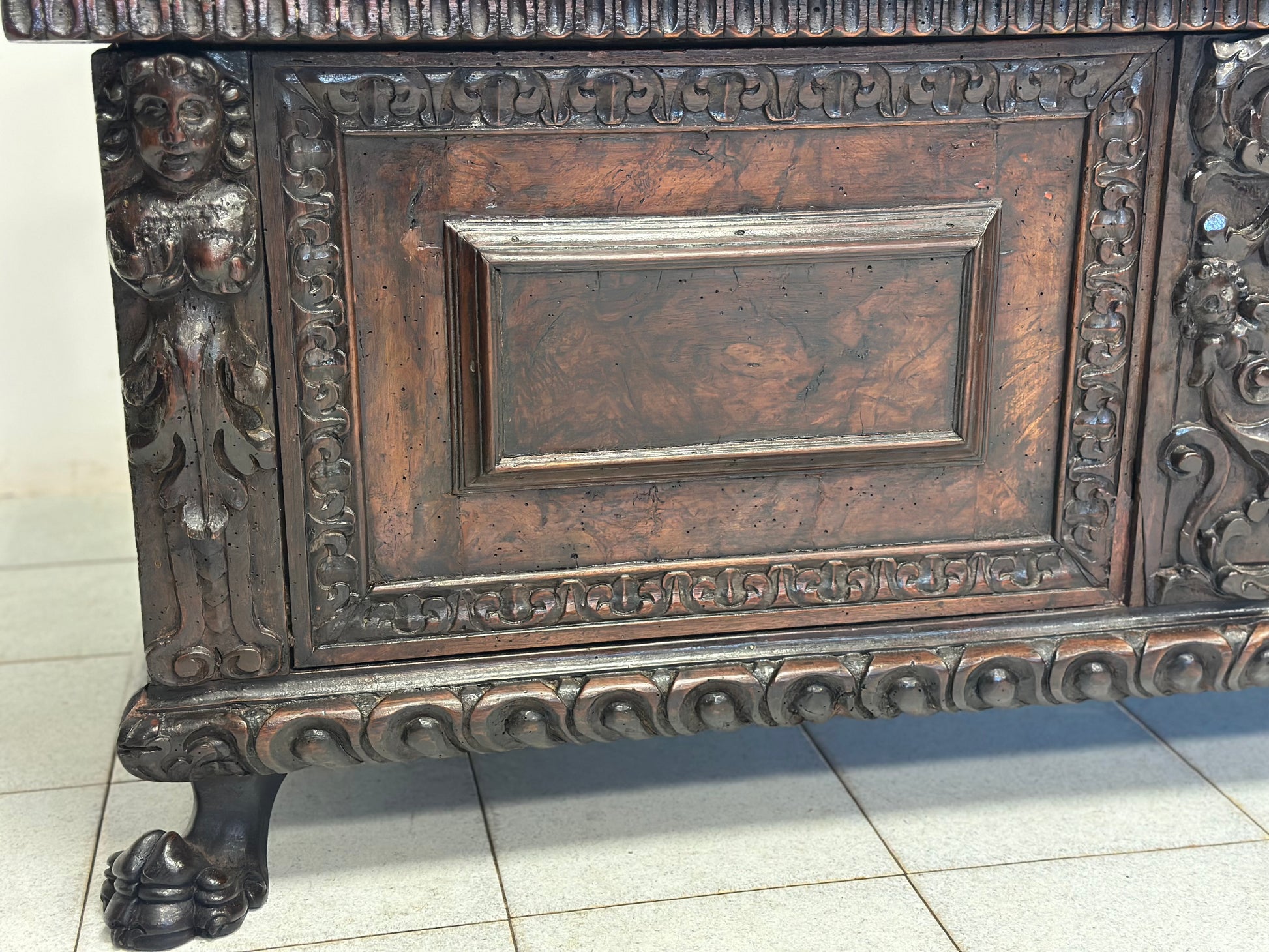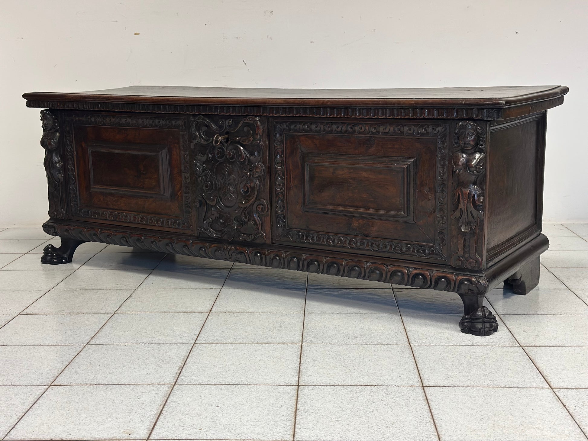 Importante cassapanca nobiliare rinascimentale epoca primi anni del 600 di zona lombarda esattamente città di Bergamo costruita rigorosamente tutta in noce fronte con specchiature in radica cariatidi scolpite sui montanti stemma nobiliare al centro intagliato base baccellata unghiata con piedi ferini