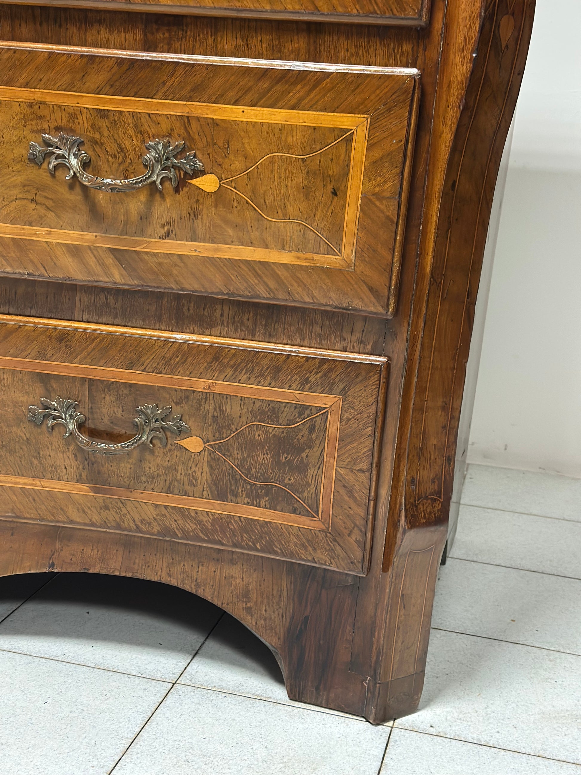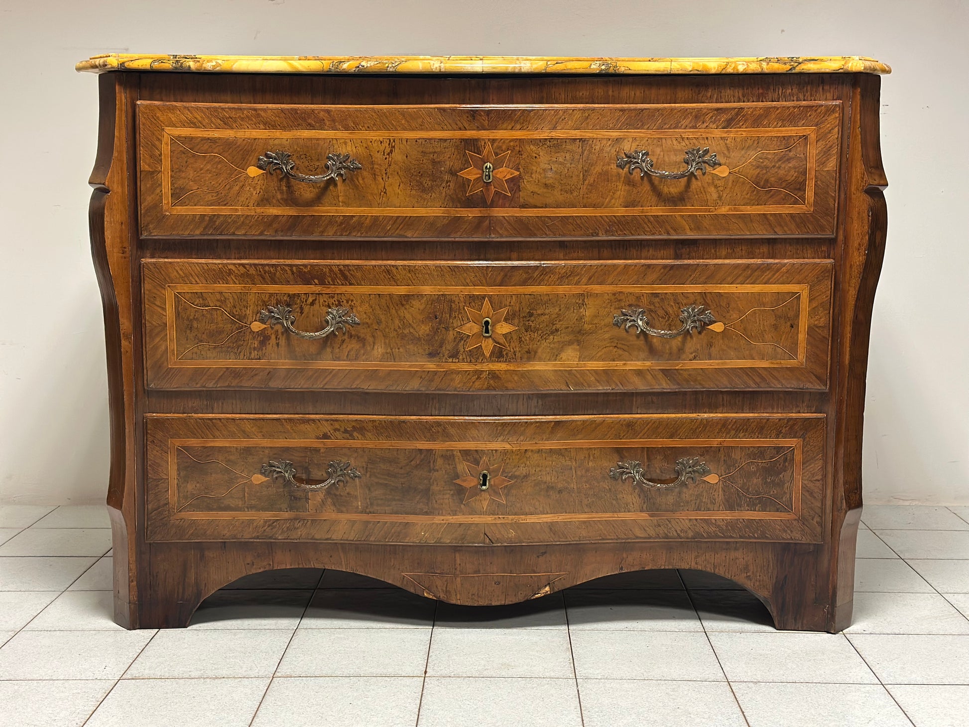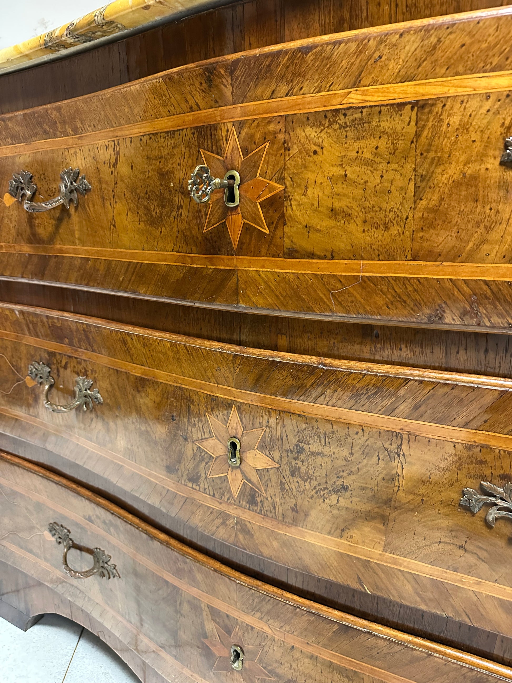 Cassettone Napoletano Luigi XV del 1700, a tre cassetti sagomati, interamente lastronato in noce e radica di noce finemente intarsiato in bosso e acero con medaglie sui cassetti e fianchi grembiule sagomato piano superiore lastronato in marmo giallo Siena