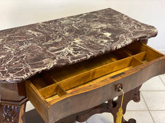 Consolle lombarda epoca Carlo X tutta in noce e piuma di noce un cassetto sottopiano sagomato gambe a ricciolo piano in marmo