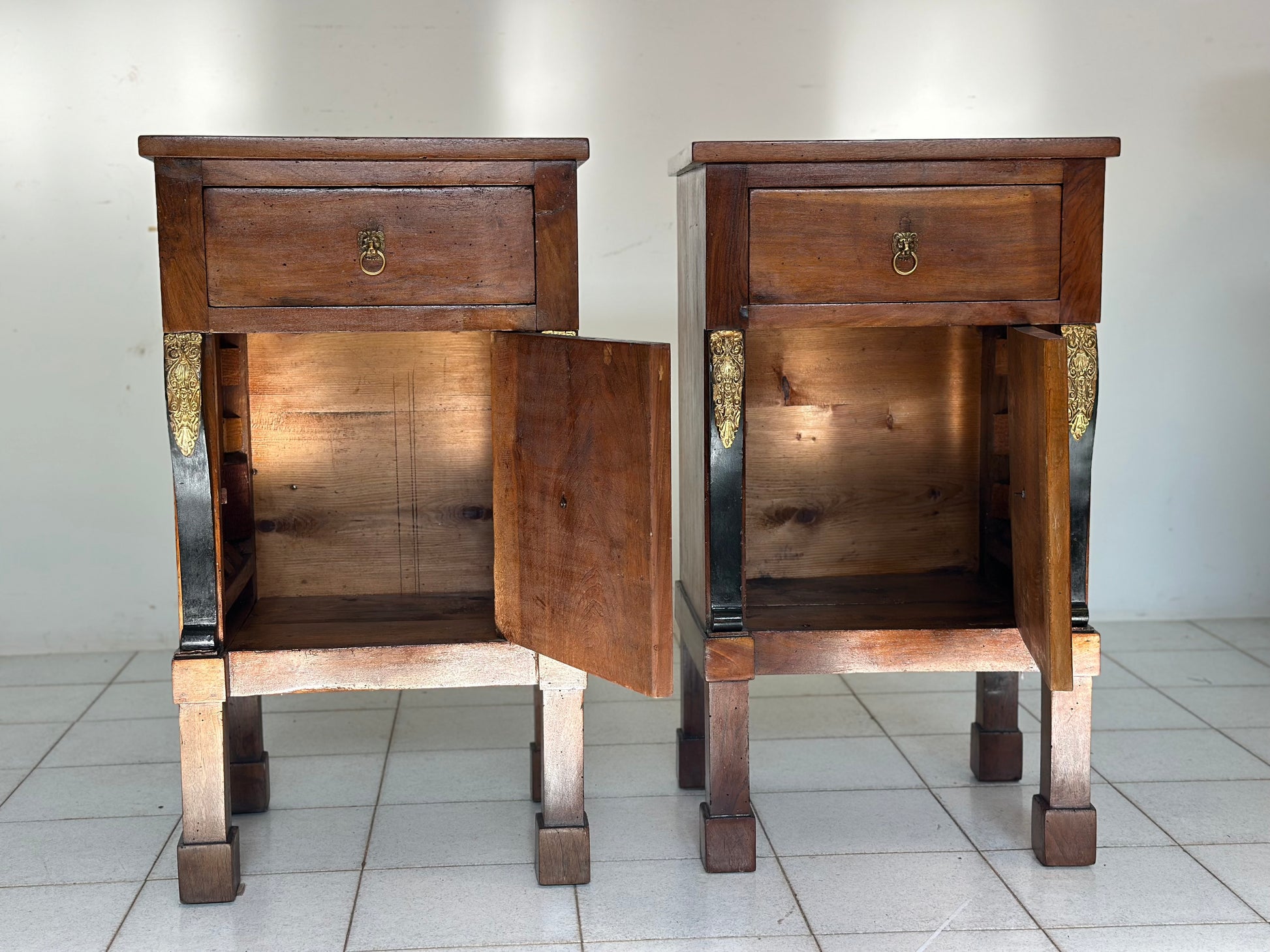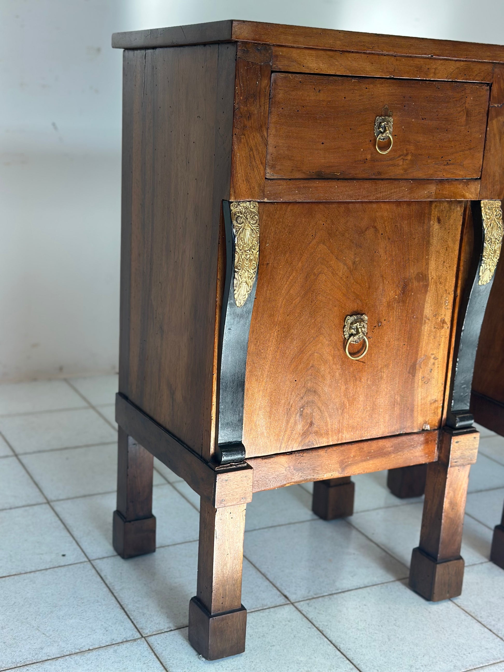 Coppia di comodini impero impero tutti costruiti in noce epoca inizio 800 poggianti su piedi a plinto alti , colonne a bretelle ebanizzate con fregi in bronzo dorato una porta con un cassetto sottopiano