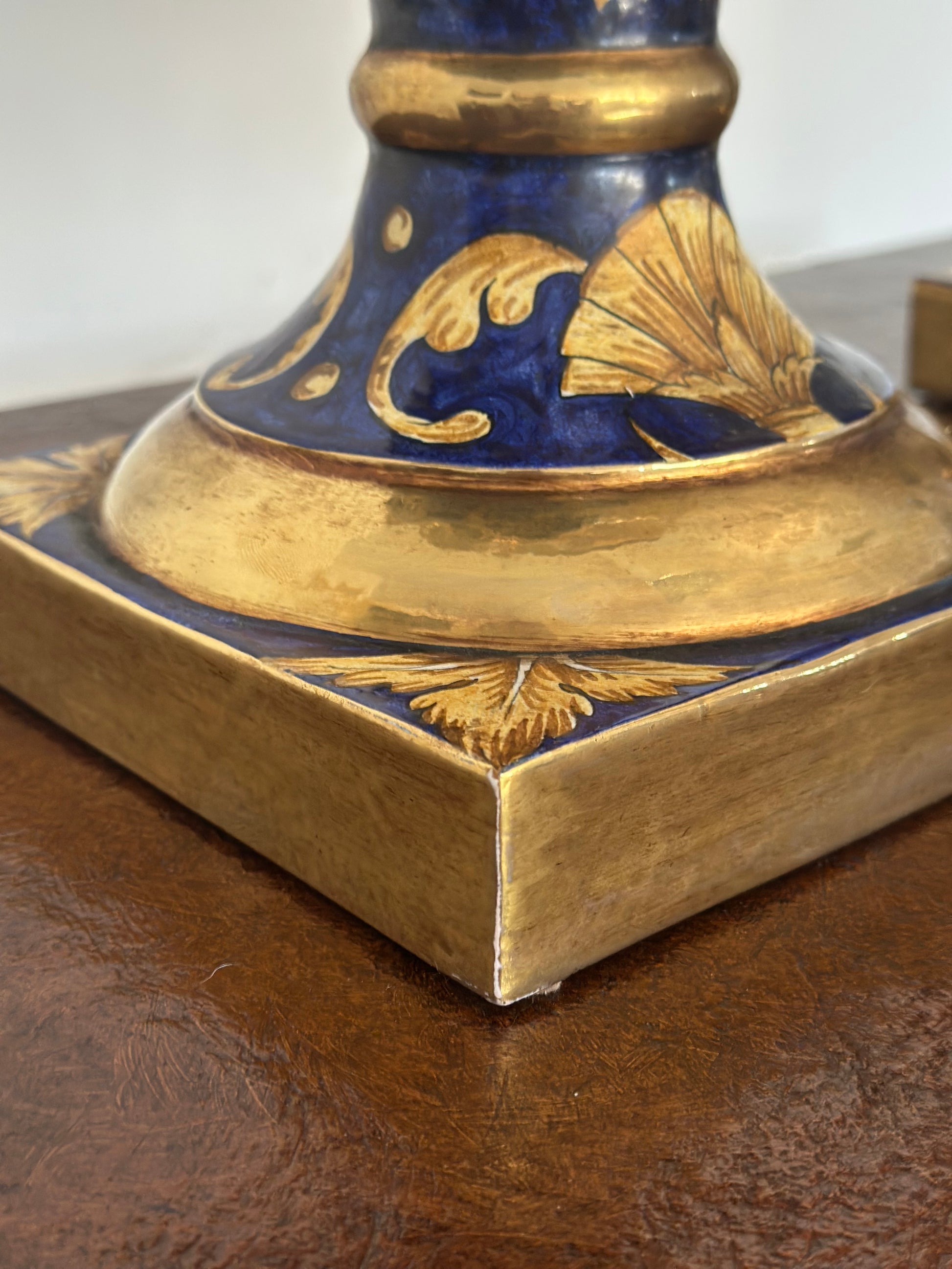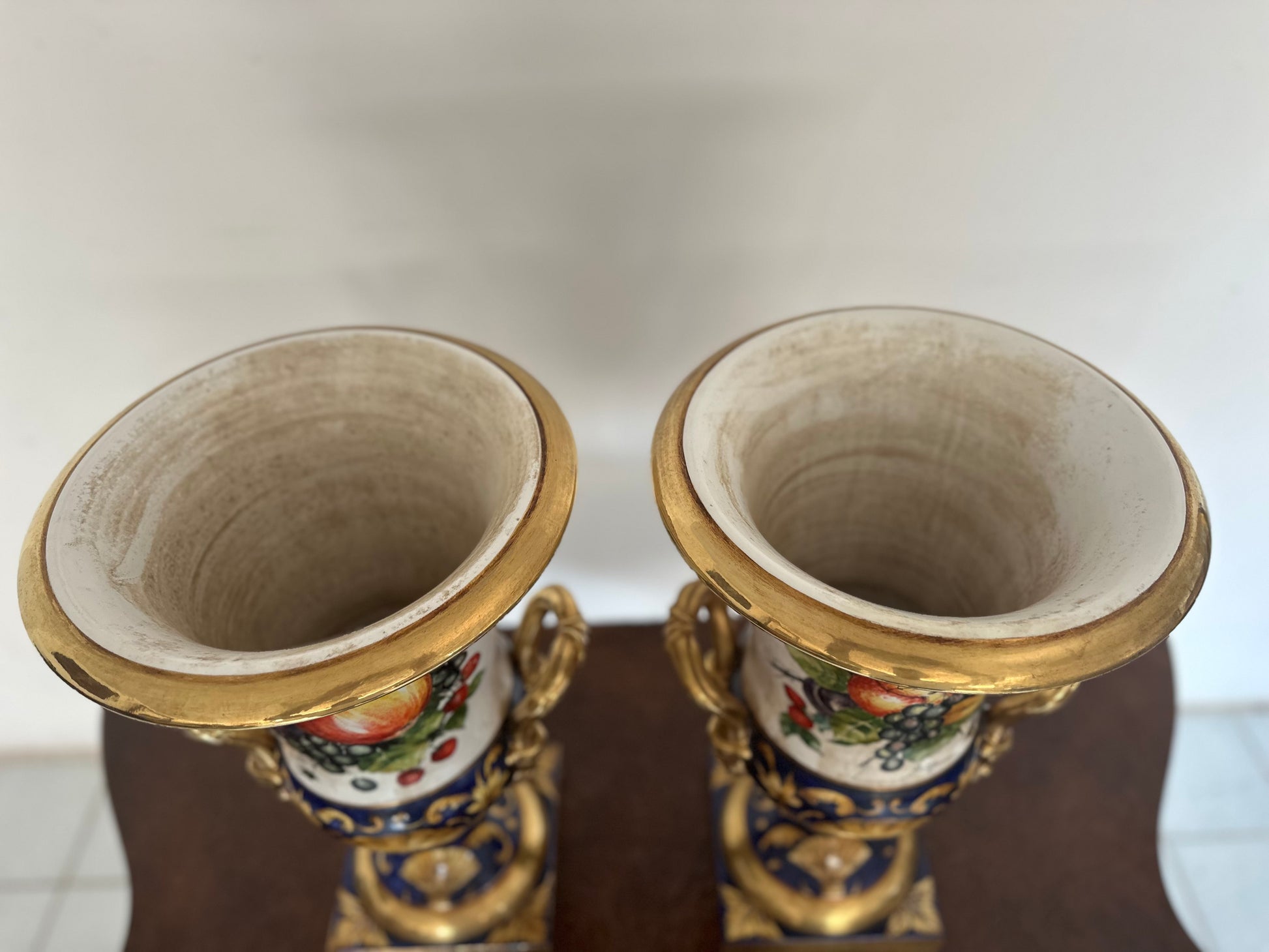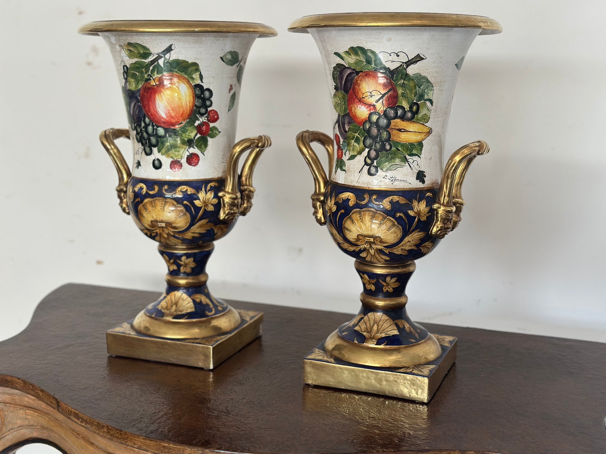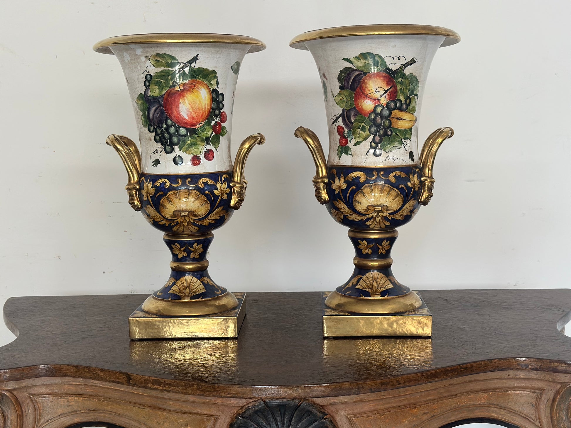 Coppia di vasi medicei in ceramica dipinta con decorazioni di frutta manici e base in foglia oro zecchino firmati alla base Batignani epoca XX secolo