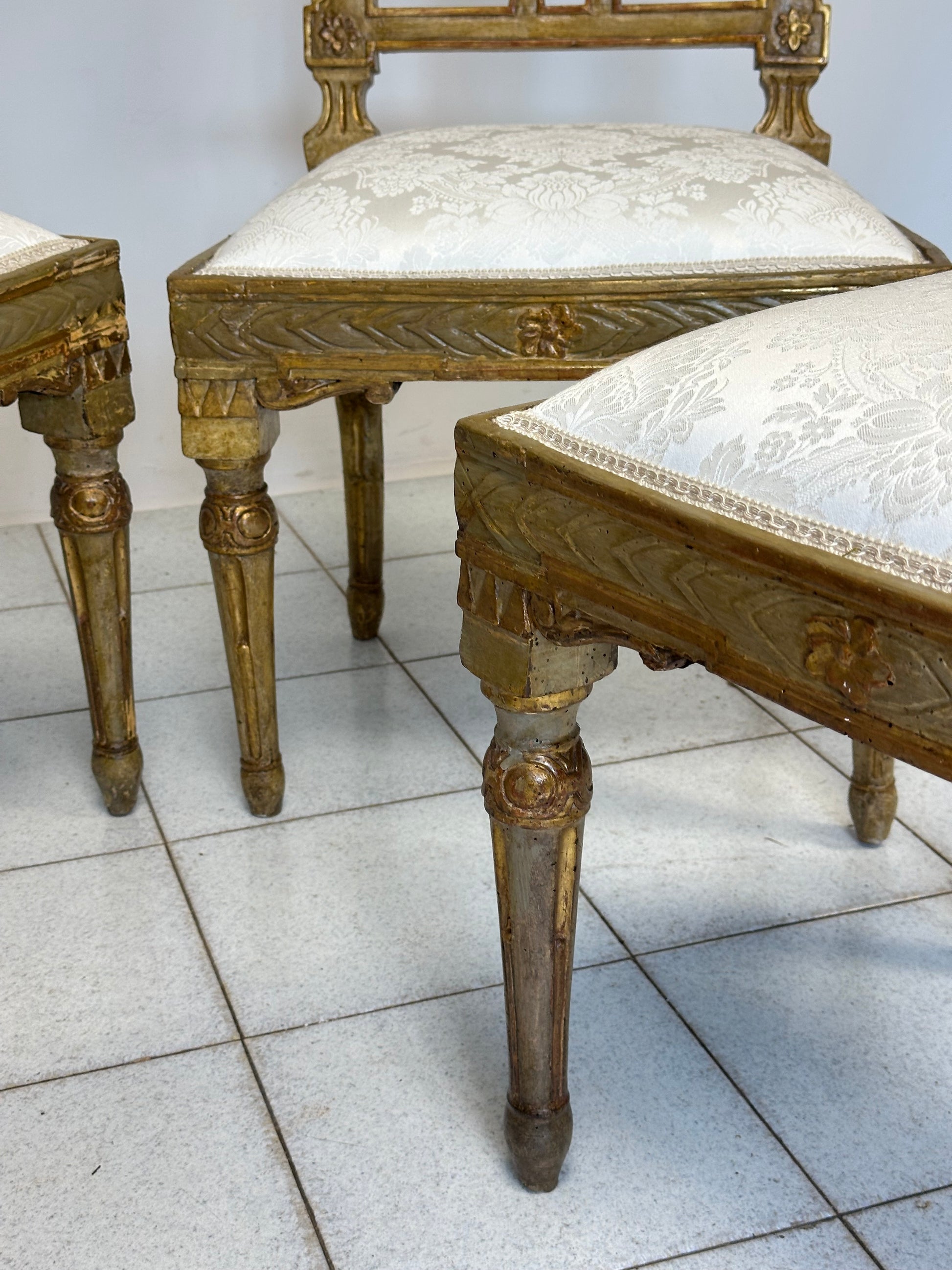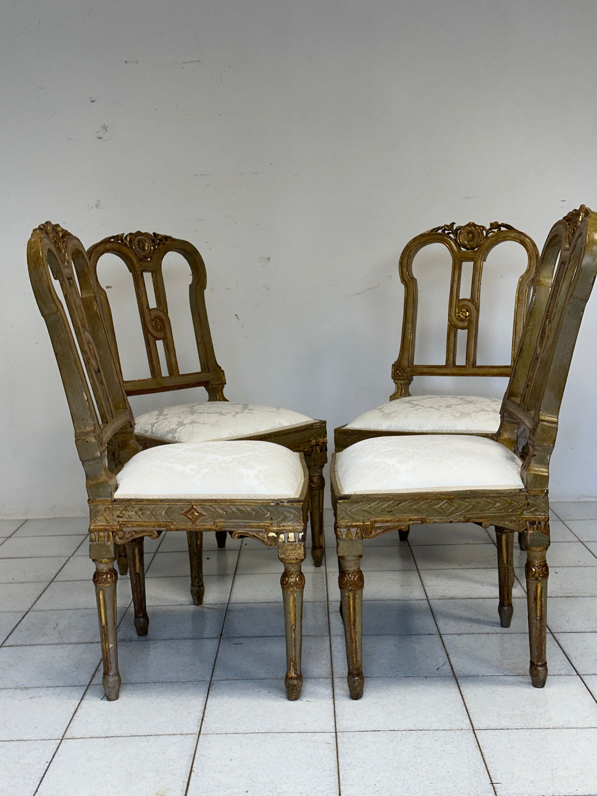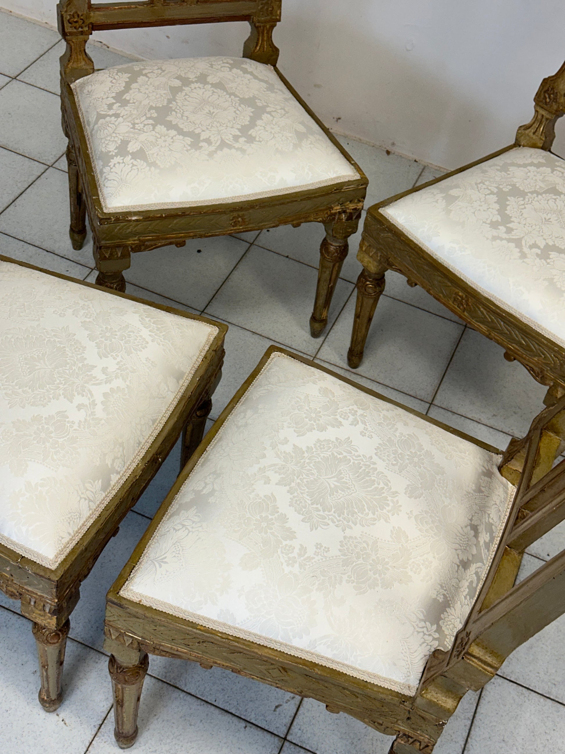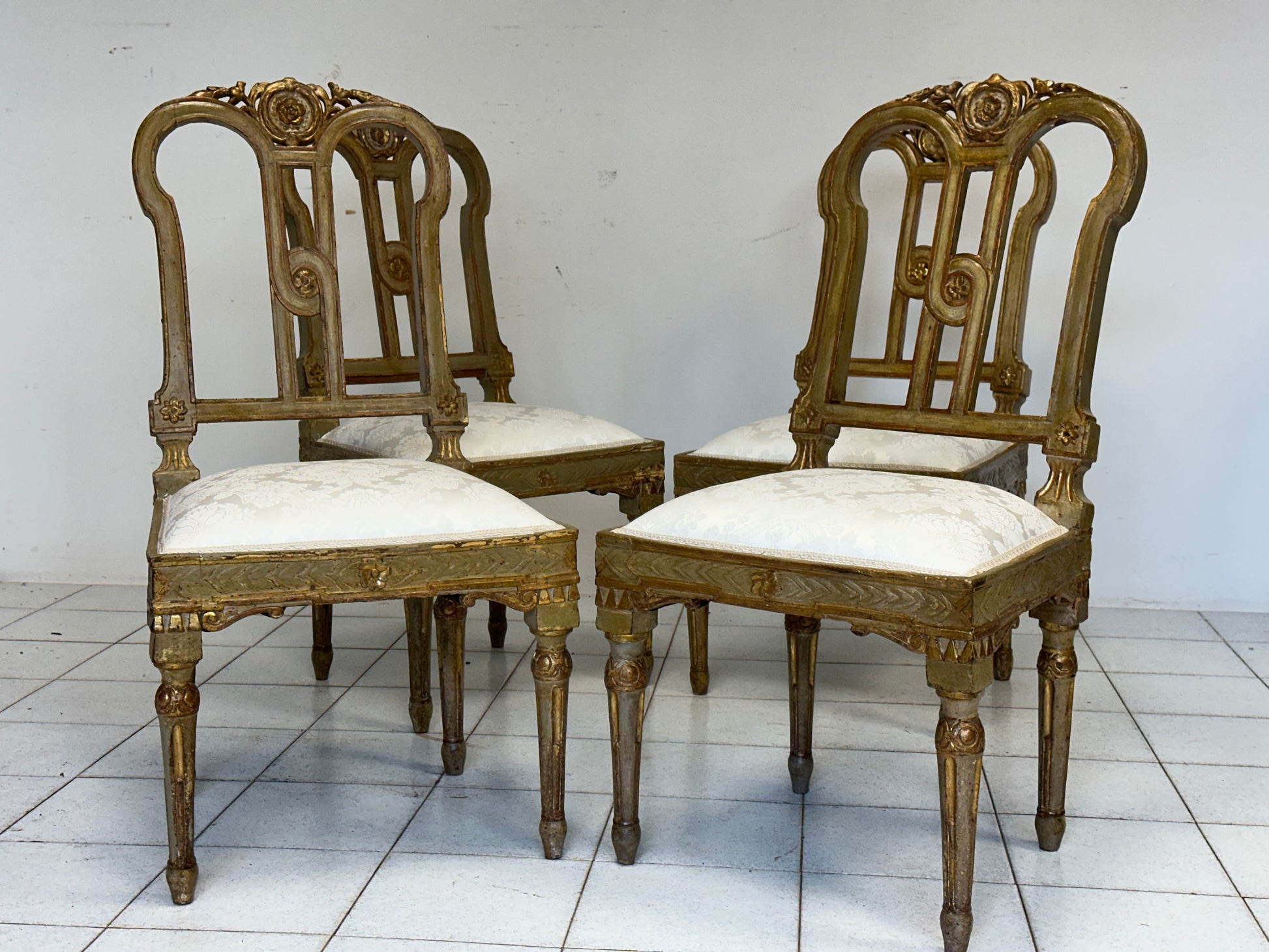 Gruppo di quattro sedie Luigi XVI laccate e dorate. XVIII secolo. Restaurate