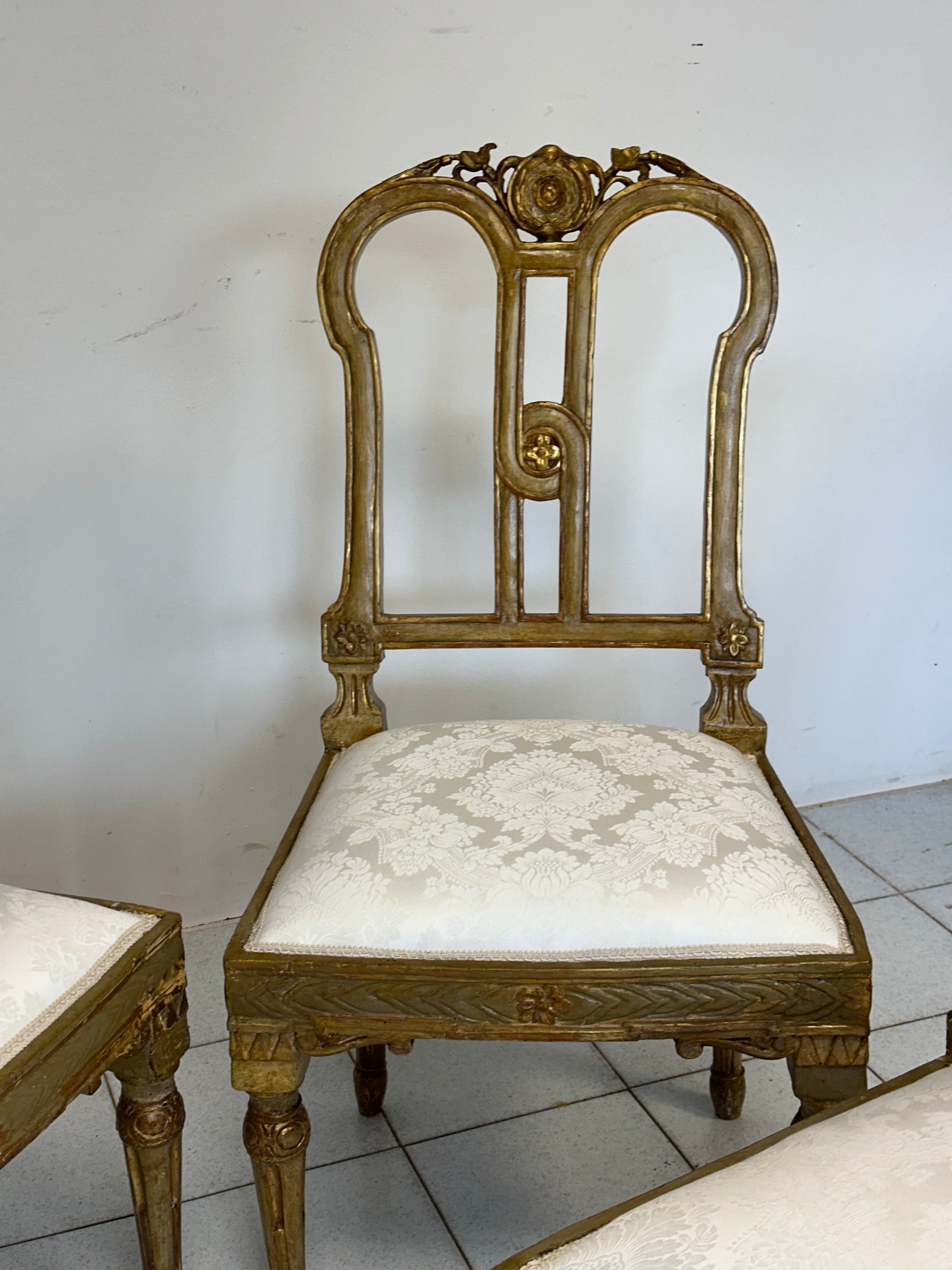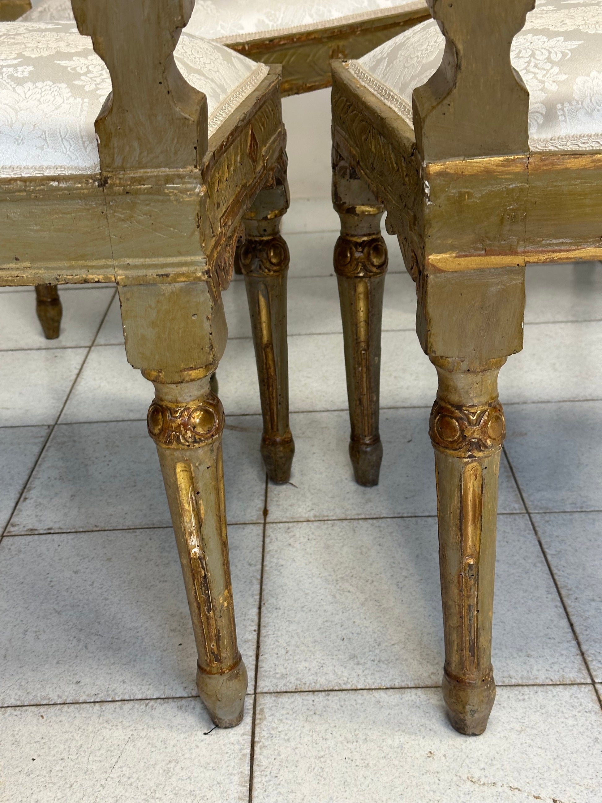 Raro gruppo di quattro sedie venete della fine del’700 in lacca verde acqua con dorature in foglia oro gambe a bottiglia scanalate con leggera strozzatura in cima schienale traforato sagomato