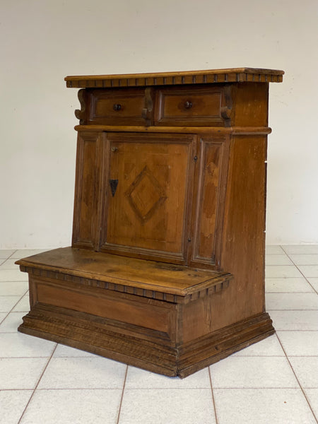 Inginocchiatoio Lombardo in legno di noce due cassetti sottopiano e uno sportello filettato in acero piano alla base apribile