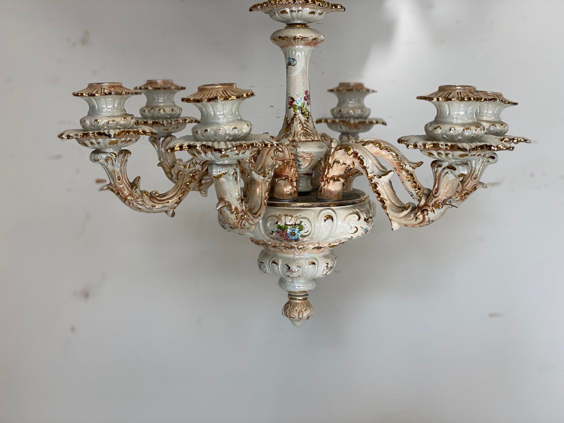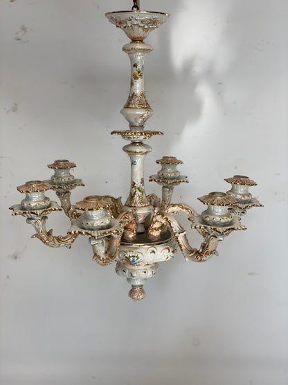 Lampadario a sei luci in ceramica di bassano decorato a mano dipinto con filettature a foglia oro epoca metà 900 integro in ogni sua parte pronto da appendere
