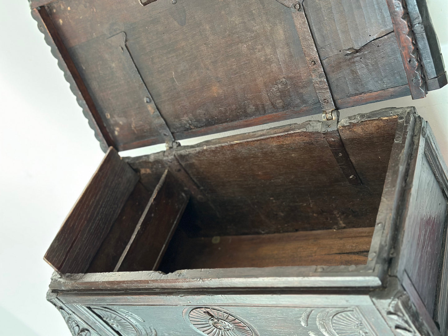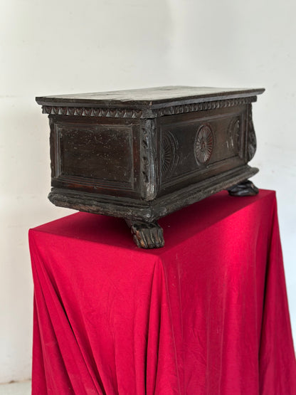 Modellino di cassapanca lombarda cremonese tutta costruita in noce scolpita e intagliata piedi ferini foglie d’acanto sui lati e stemmi centrali scolpiti dentello unghiato sottopiano