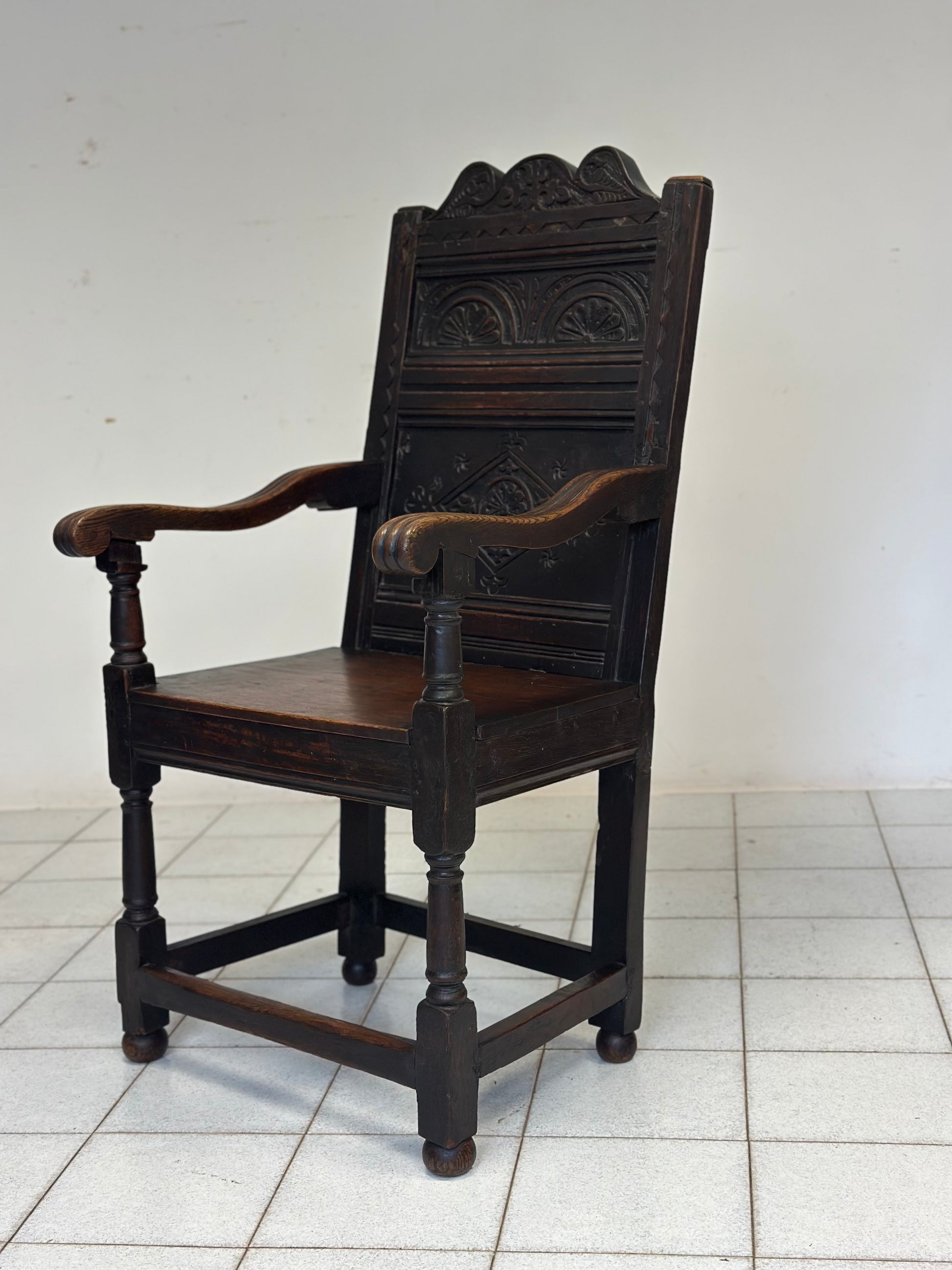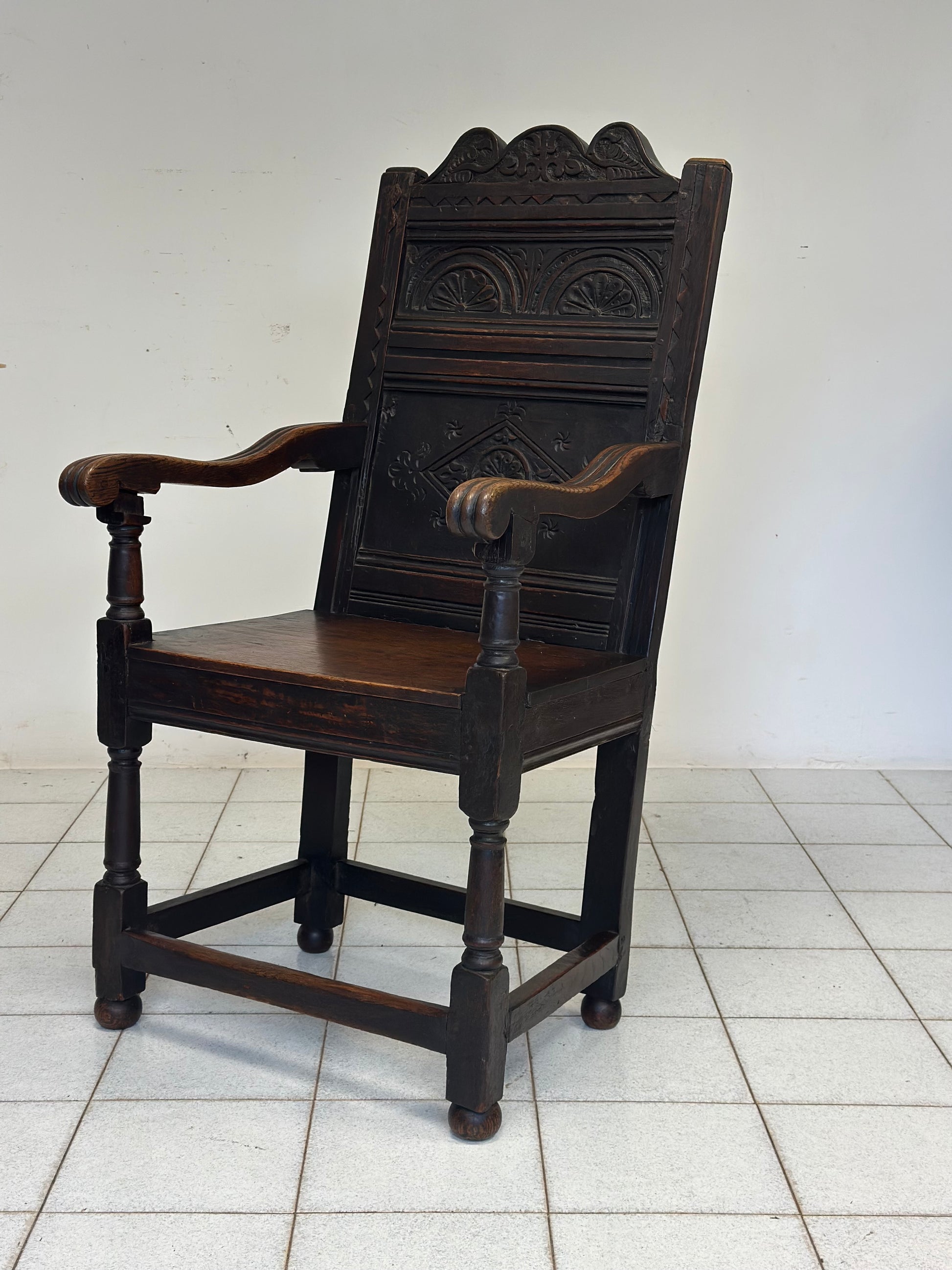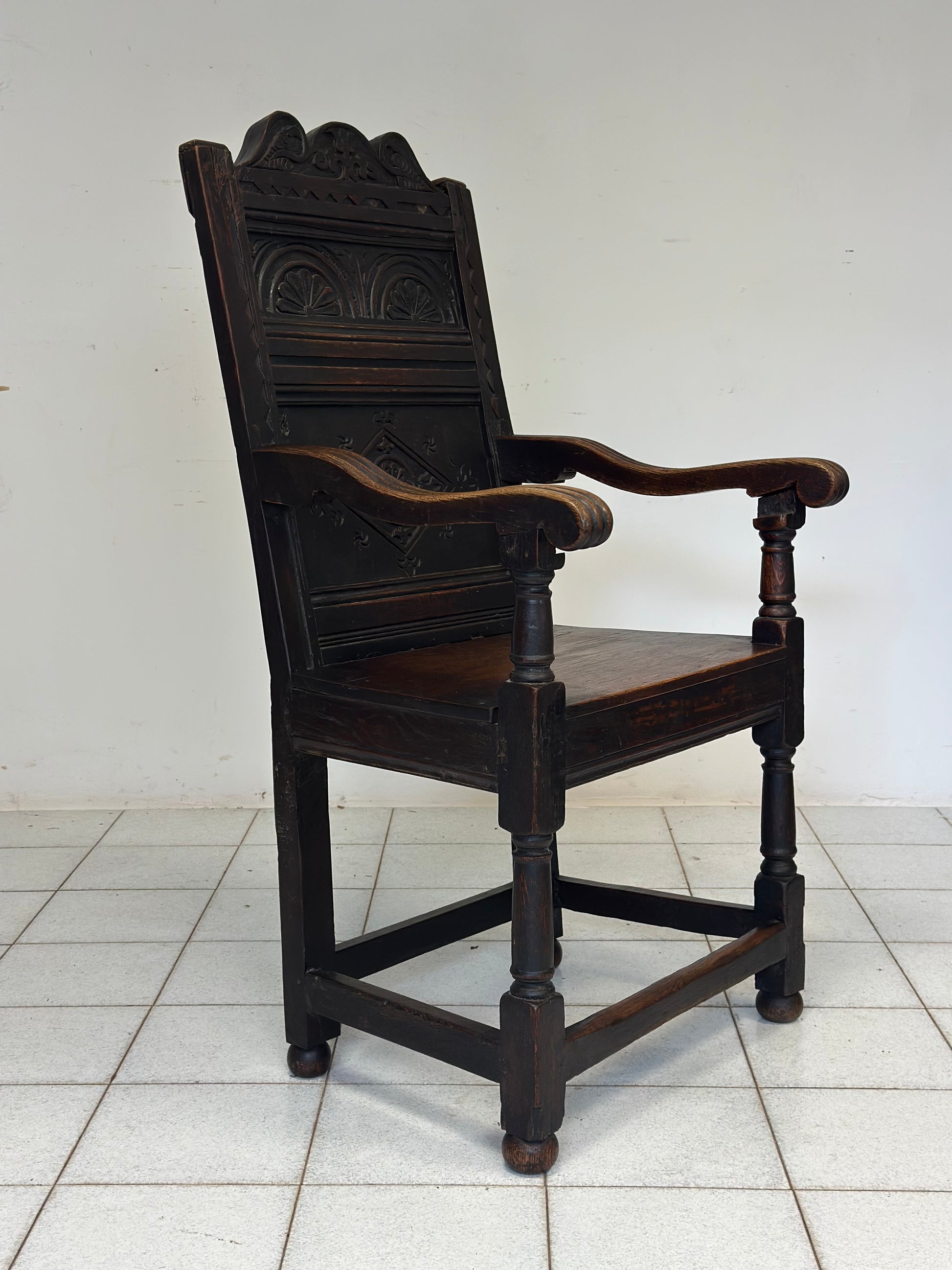 Poltrona Wainscot Giacobina tutta costruita in rovere massello epoca pieno 700 con schienale sagomato intagliato scolpito gambe raccordate tornite braccioli sagomati . Seduta e schienale massello
