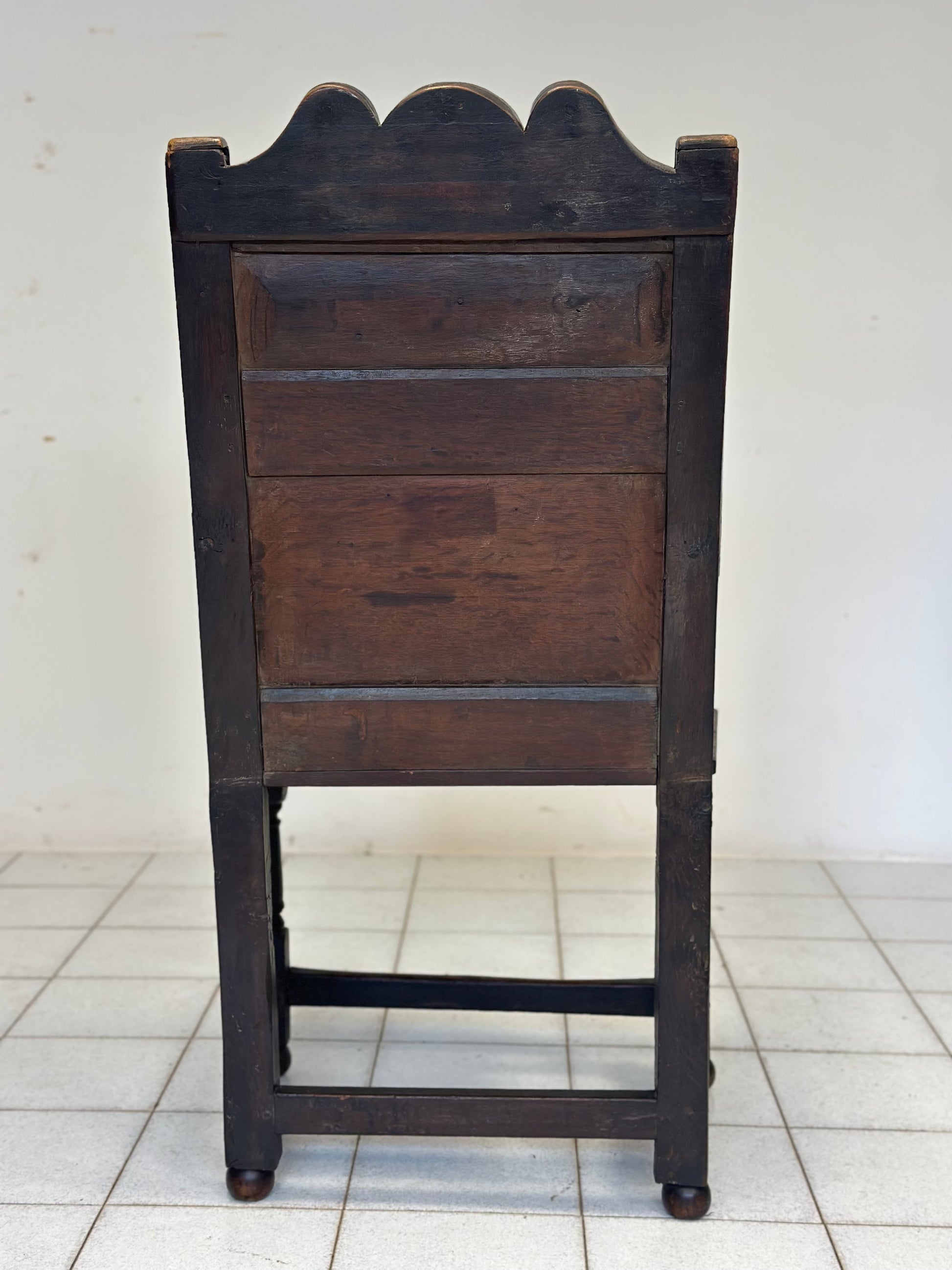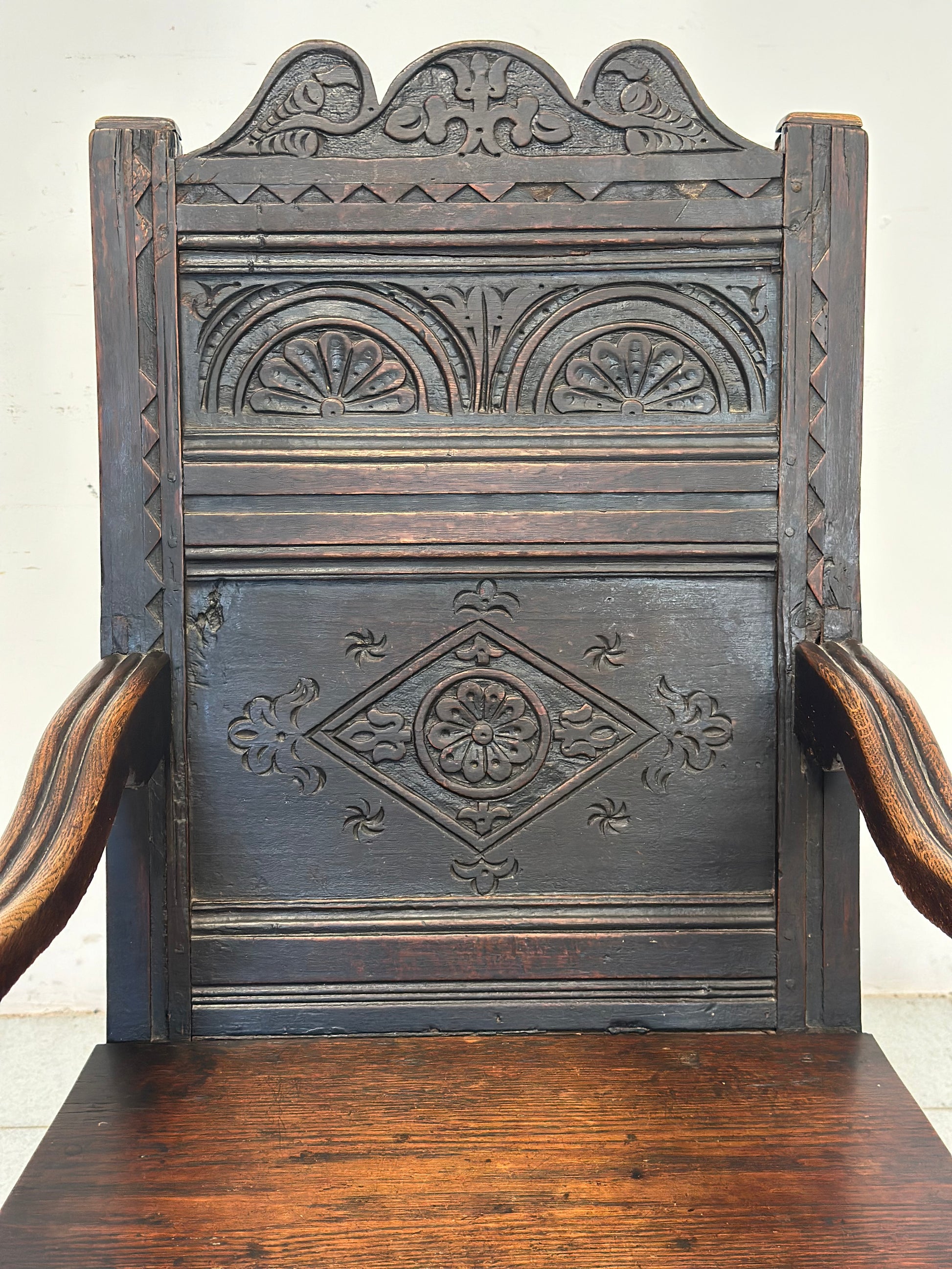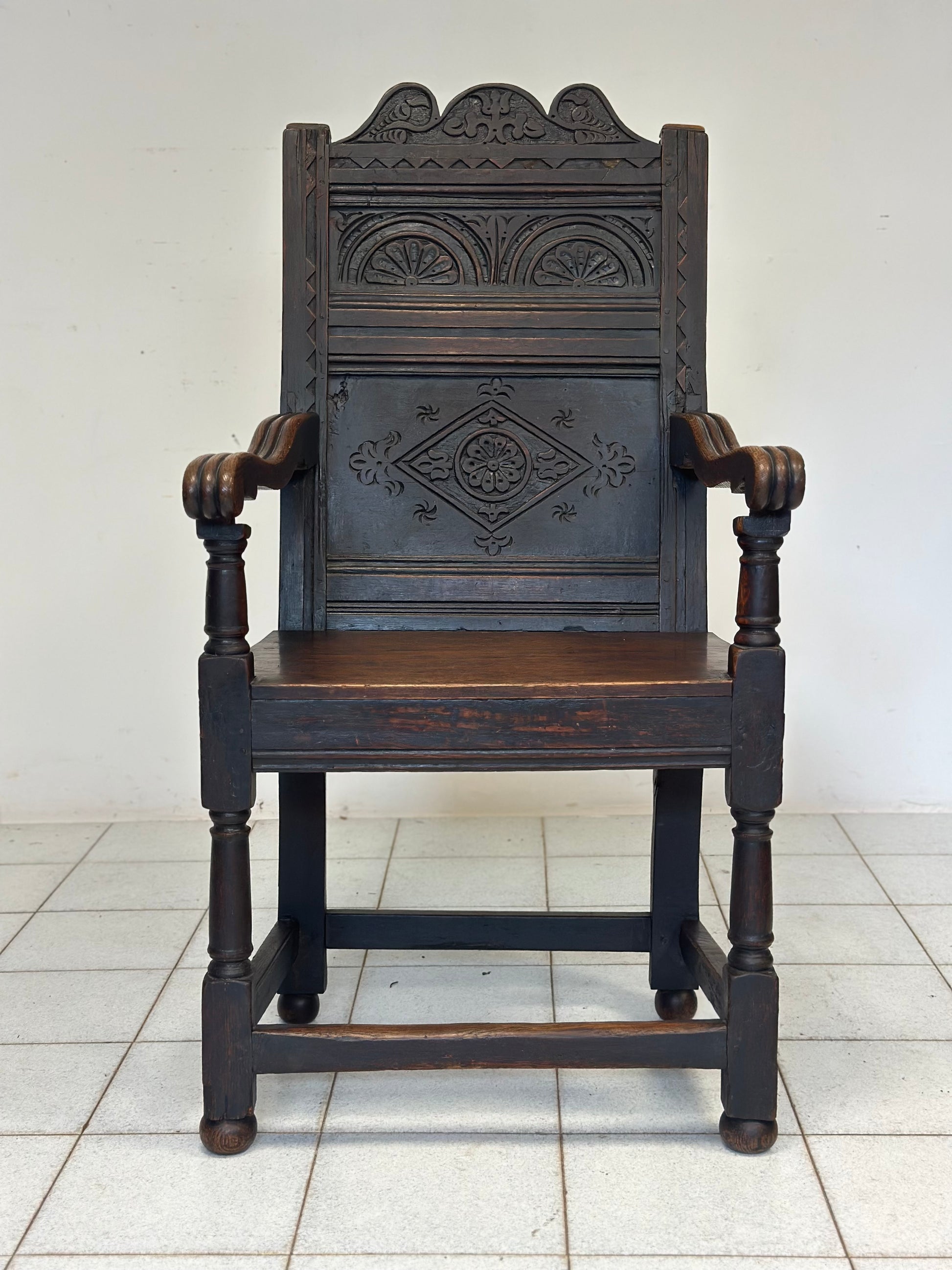 Poltrona Wainscot Giacobina tutta costruita in rovere massello epoca pieno 700 con schienale sagomato intagliato scolpito gambe raccordate tornite braccioli sagomati . Seduta e schienale massello