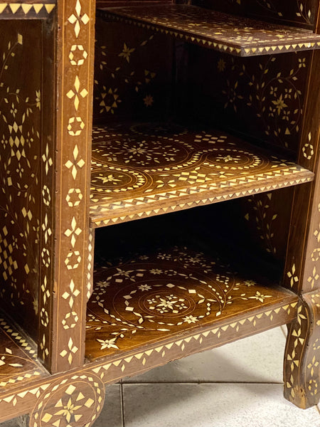 Credenza a giorno con due portine laterali e varie mensole con poltroncina abbinata di zona lombarda in legno di mogano in parte ebanizzata completamente intarsiata in osso e piccole parti in avorio alla maniera di Adriano Brambilla