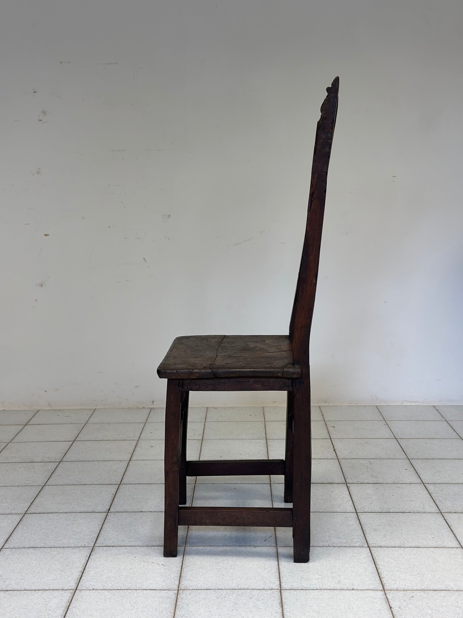 Sedia seggiolone a cartella in noce massello realizzata in Lombardia nei primi del’600 , struttura alta e slanciata presenta uno schienale riccamente intagliato con un filetto e radica di noce . La decorazione si ripresenta sulla traversa anteriore inferiore tipico della lavorazione rinascimentale barocco . la sedia si presenta in prima patina