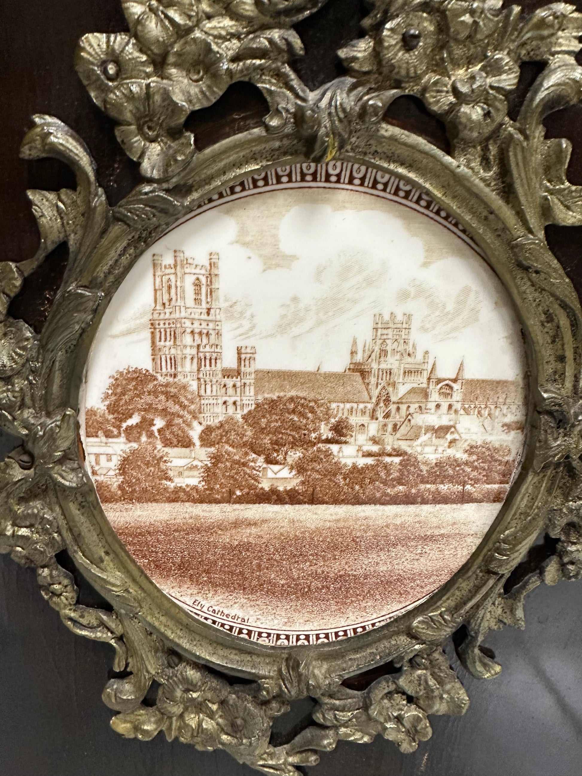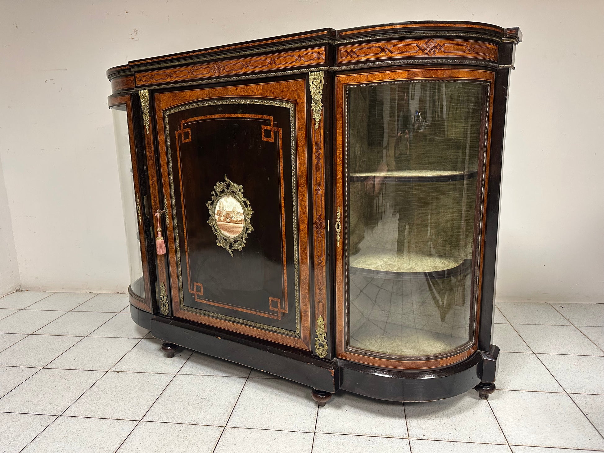Sportello centrale delimitato da decorato medaglione in porcellana raffigurante una paesaggio entro cornice in bronzo, fianchi convessi con anta a vetro, piedi a trottola