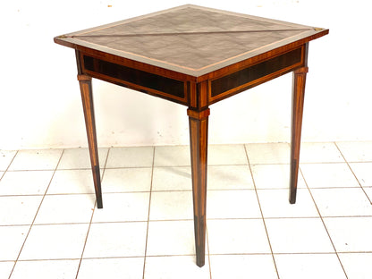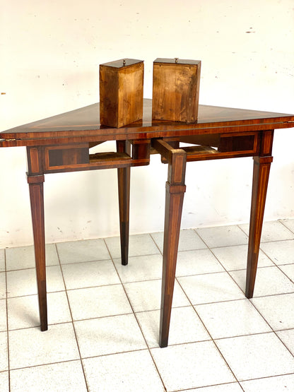 Tavolino da gioco Luigi xvi tutto lastronato in palissandro e filettato in acero piano triangolare a fazzoletto interno con riserva in cuoio mocca gambe a spillo due cassetti nella fascia sottopiano con gamba estraibile