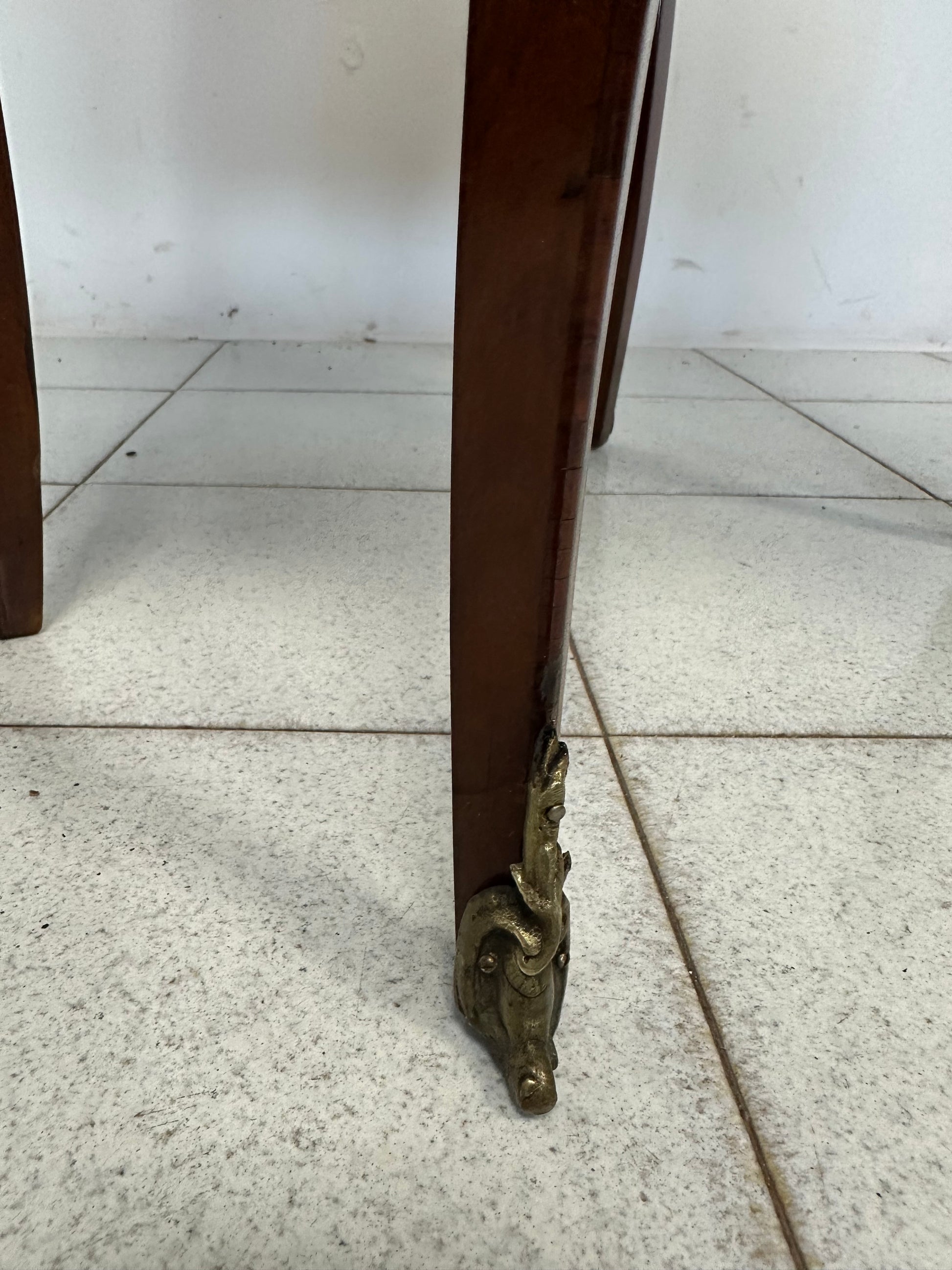 Tavolino ovale francese della seconda metà del 1800, stile Luigi XV, in legno di Palissandro e bois de violette. Presenta piano superiore riccamente intarsiato perimetrato da ringhierina in ottone, 3 cassetti centrali anch'essi riccamente intarsiati e laterali curvi in palissandro anch'essi impreziositi da ricchi motivi di intarsio; termina con gambe mosse riunite applicazioni in bronzo piano in marmo coevo carrara