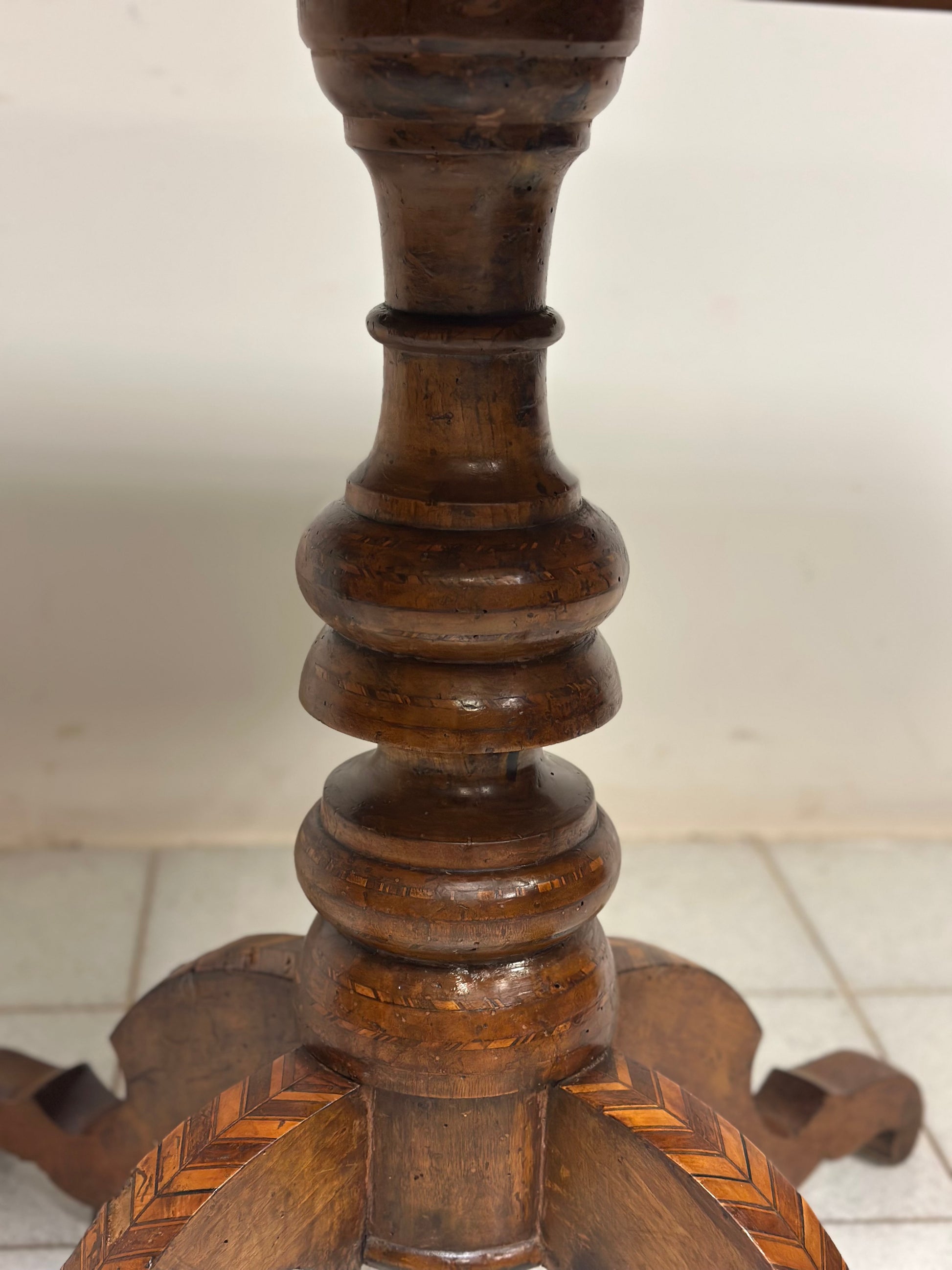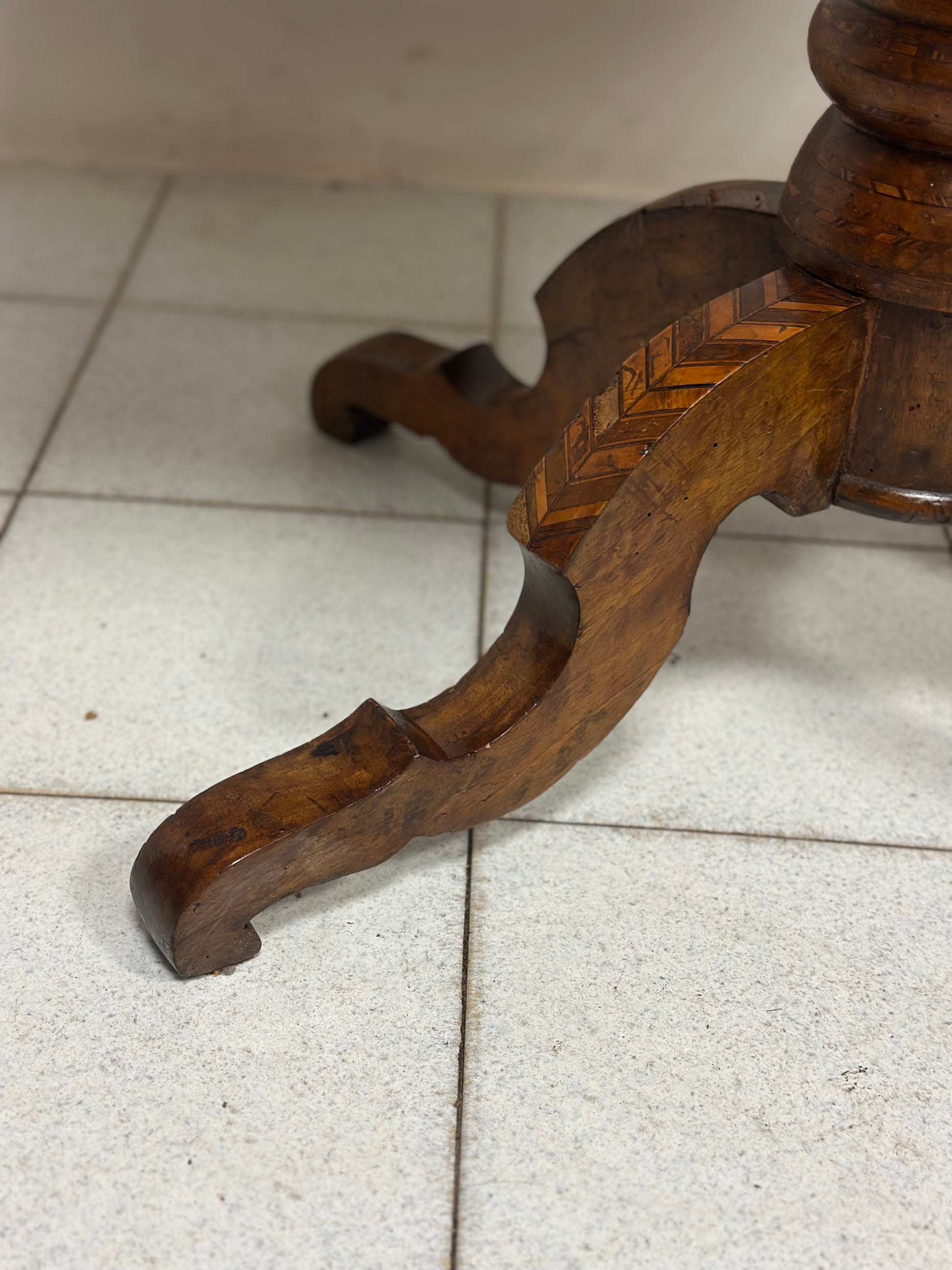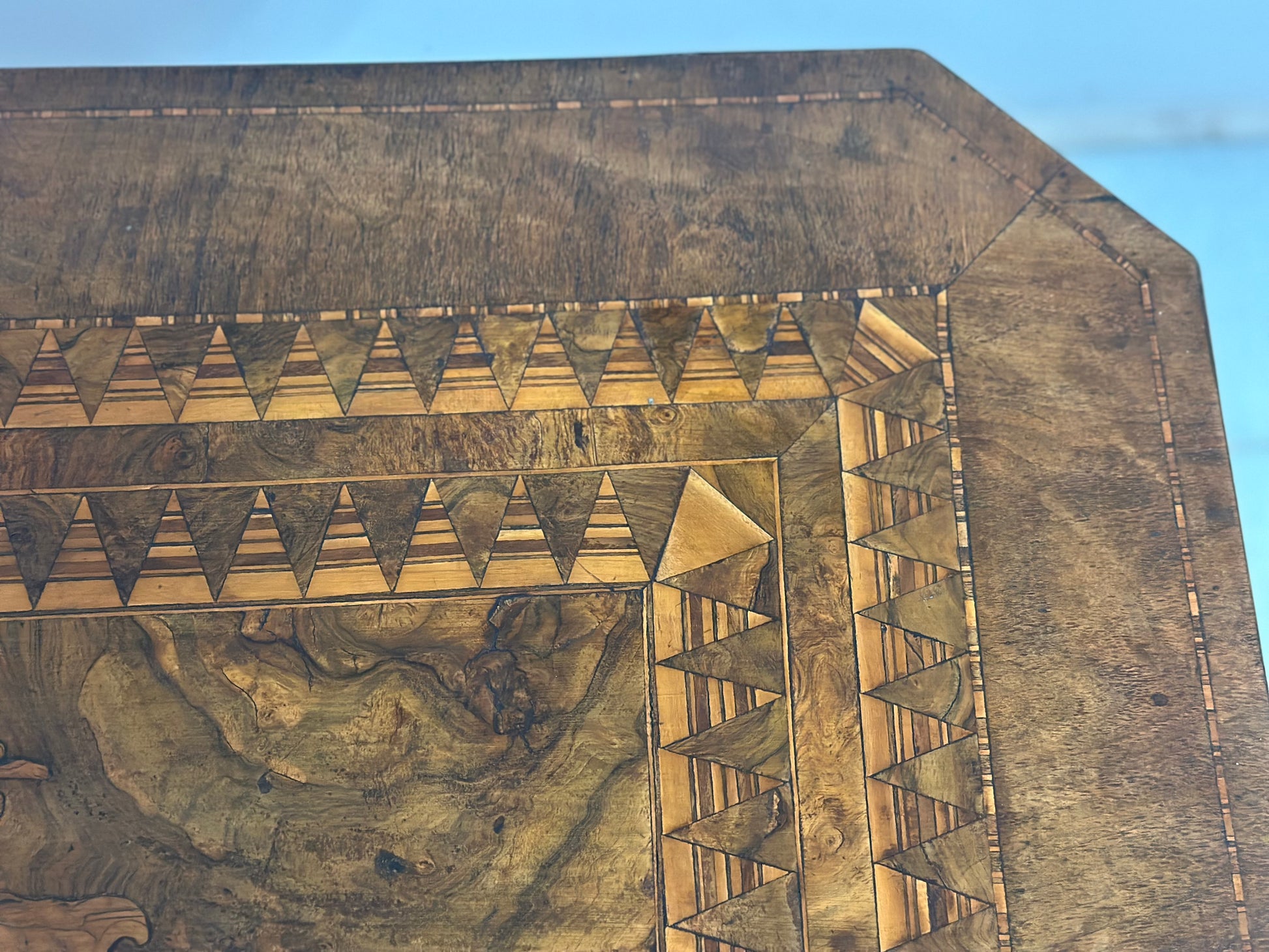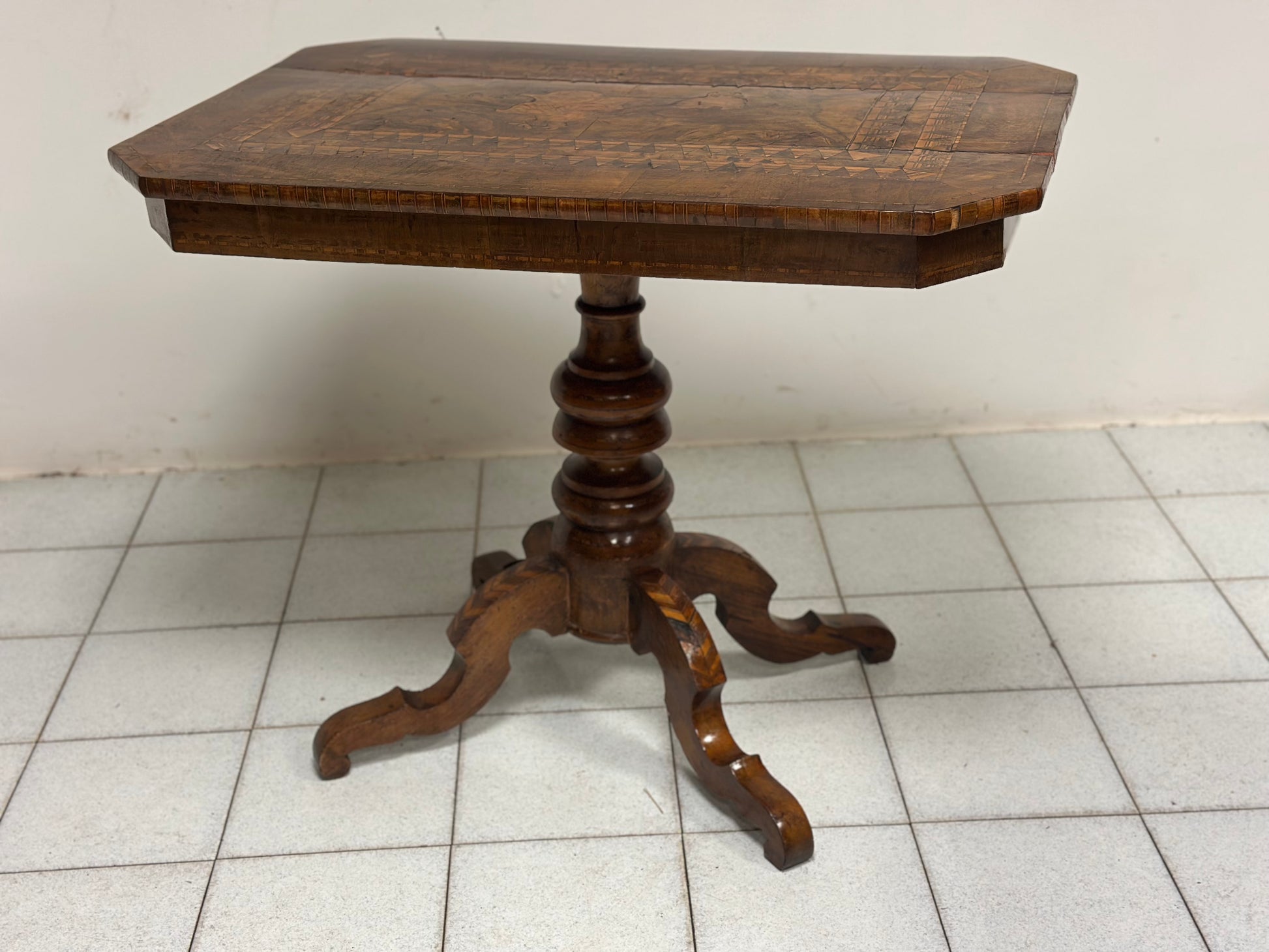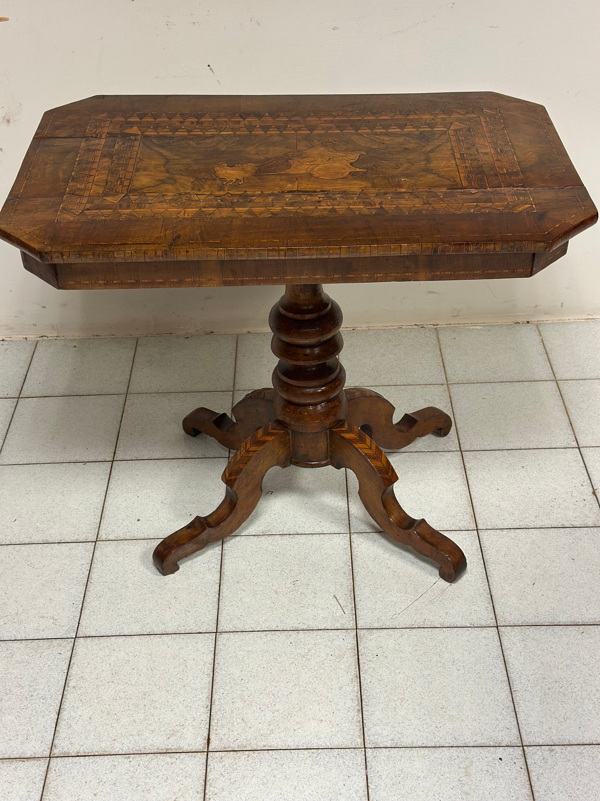 Tavolino rettangolare tutto lastronato intarsiato in noce e legni vari misti pregiati raffigurante una biga trainata dal cavallo , gambo e centrale tornito intarsiato con quattro piedi poggianti sagomati