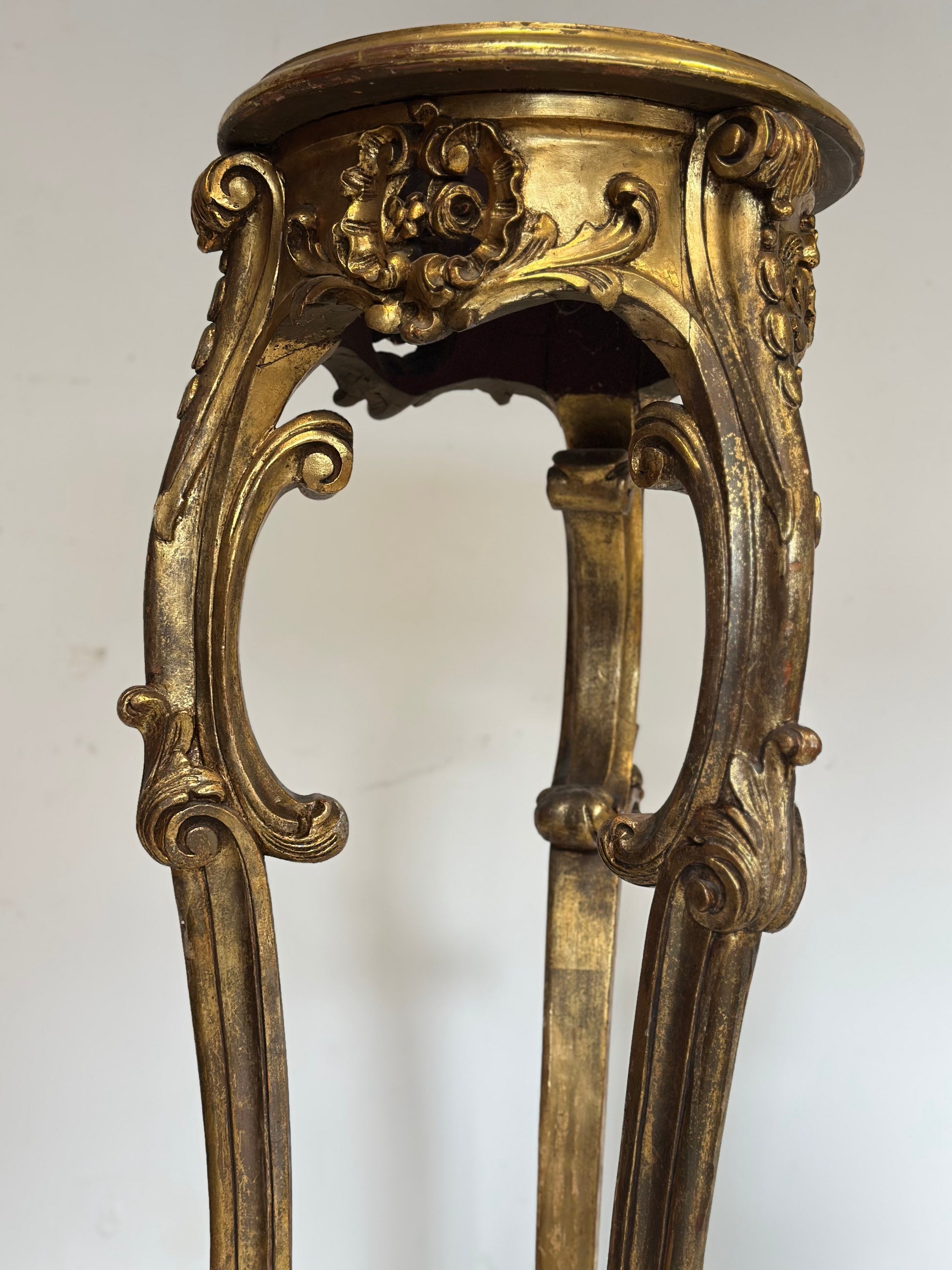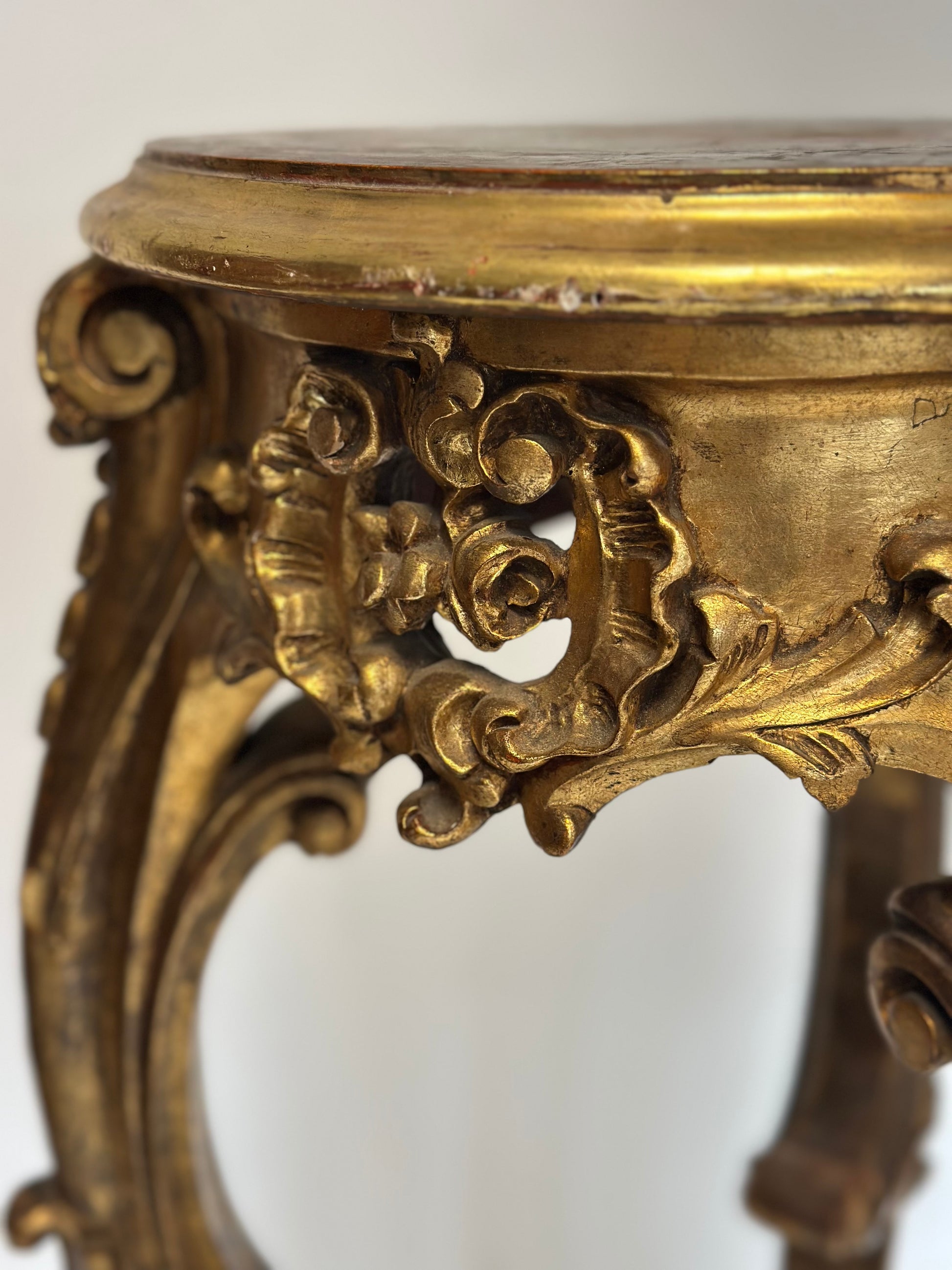 Trespolo in legno intagliato e dorato a foglia oro epoca metà 800 di area lombarda con tre gambe arcuate e un piano circolare tutto finemente scolpito a motivi floreali