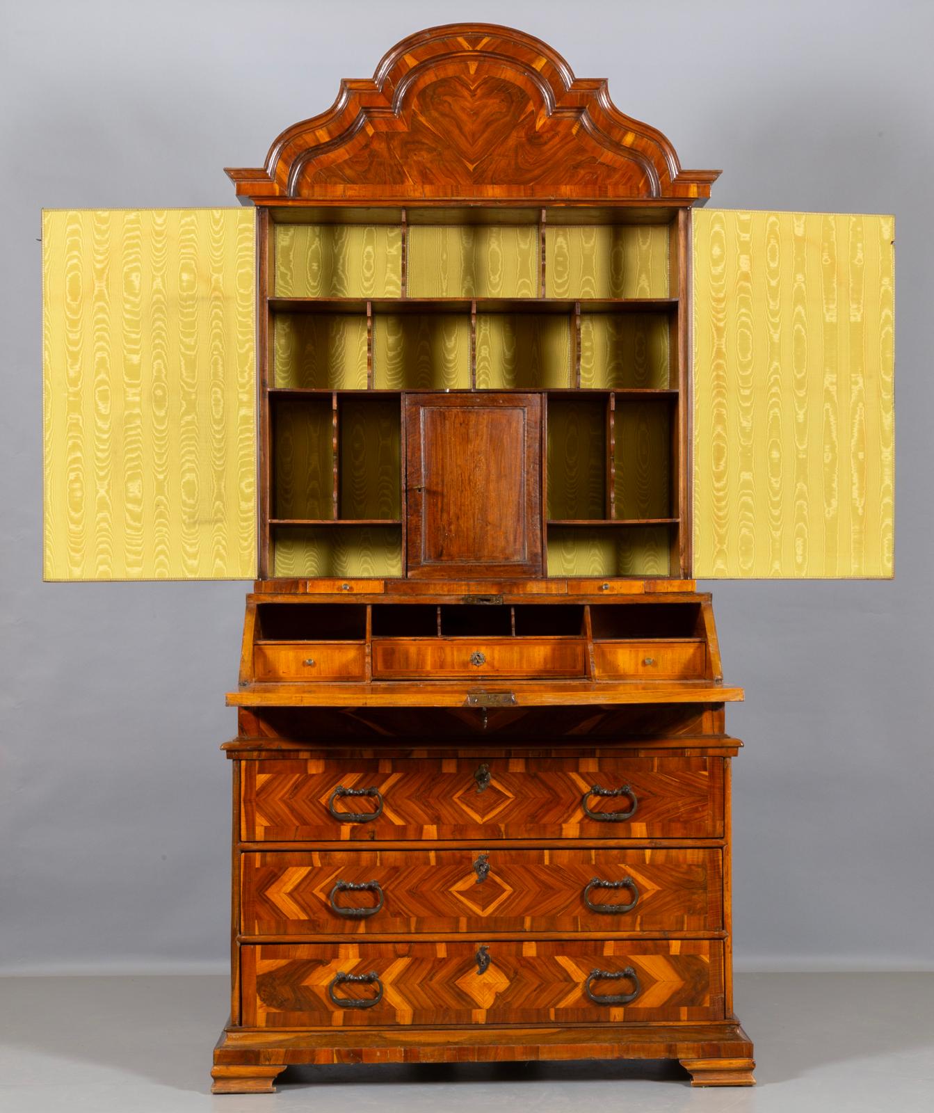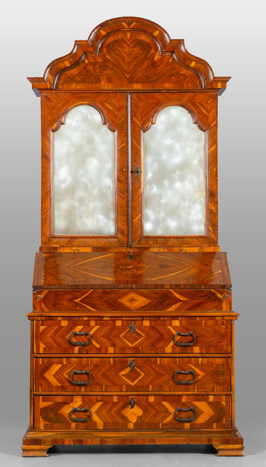 Trumeau lastronato in carrubo Venezia Luigi XIV epoca orini dell’700 parte superiore con due ante e vari scompartimenti a giorno con una porta centrale vetri al mercurio cimasa sagomata a timpano , nella parte inferiore anta celante con cassettini e vani a giorno segreto tre cassetti esterni con maniglie pendenti coeve piedi a mensola