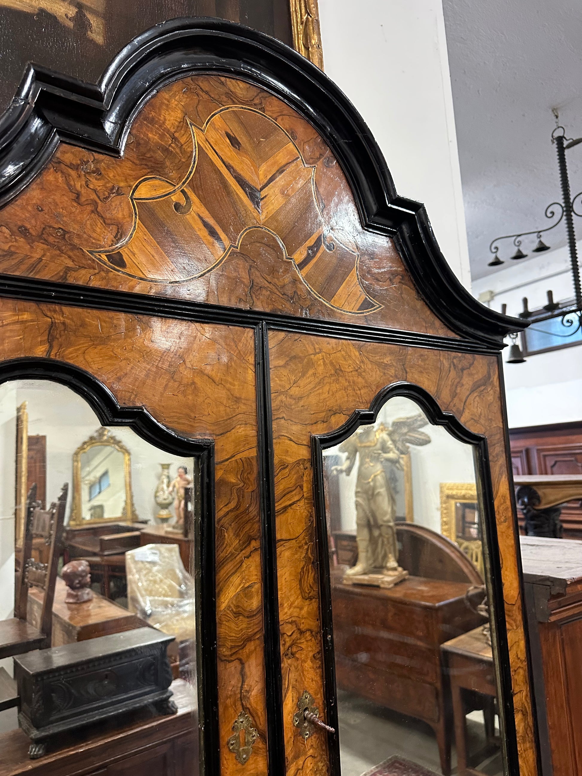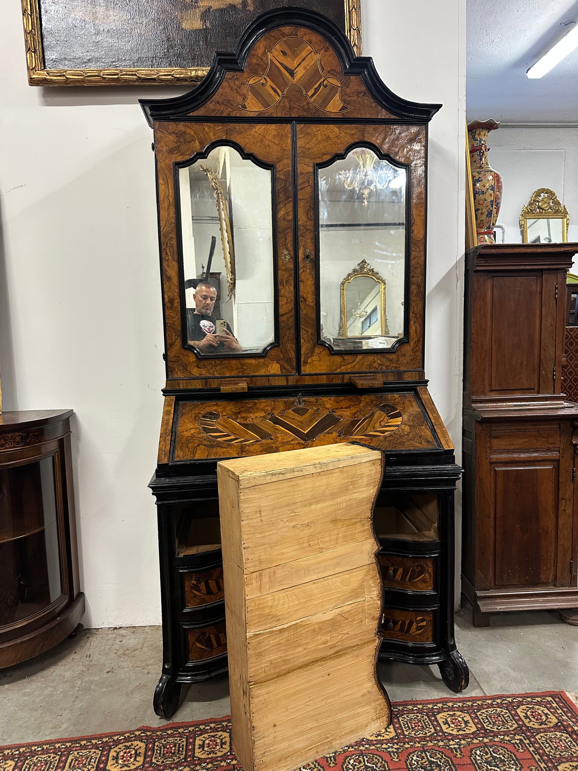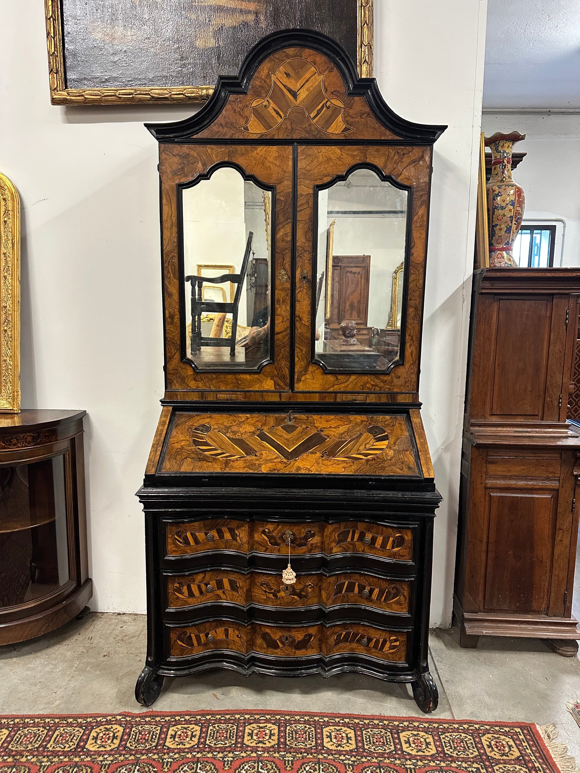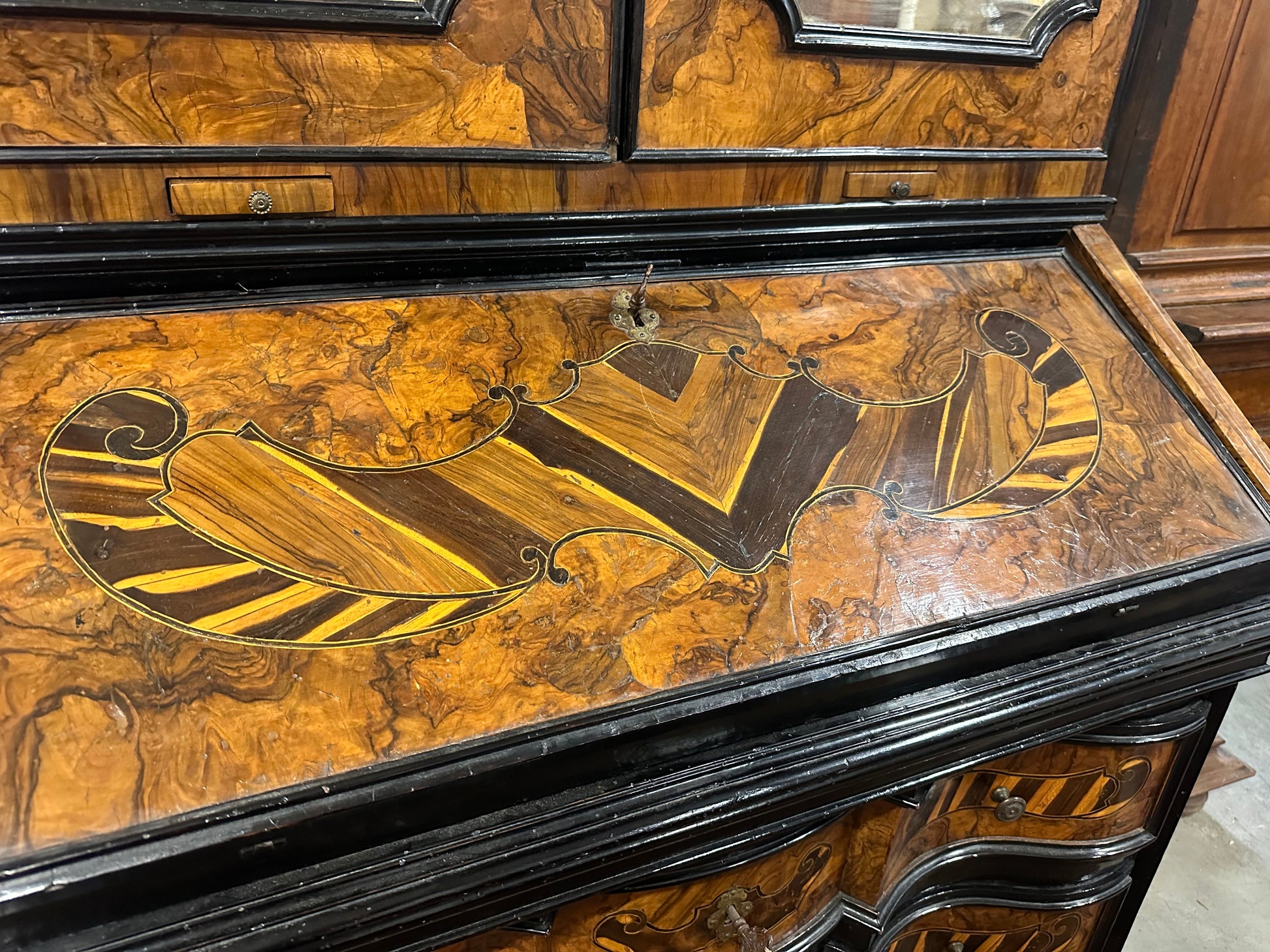 Importante trumeau lombardo luigi xv epoca primi anni del 700 sagomato sul fronte tutto lastronato in noce e radica di noce con cornici mistilinee ebanizzate , vetri al mercurio ,sei cassettini interni nello scarabattolo piedi a ricciolo coevi del periodo