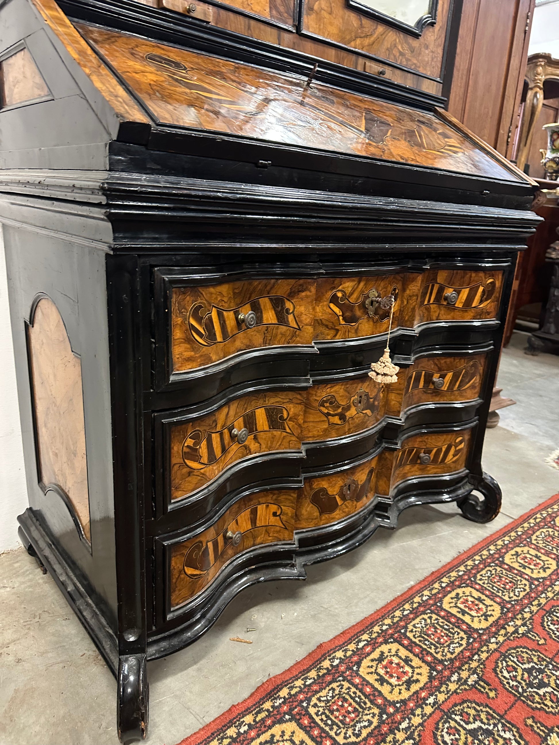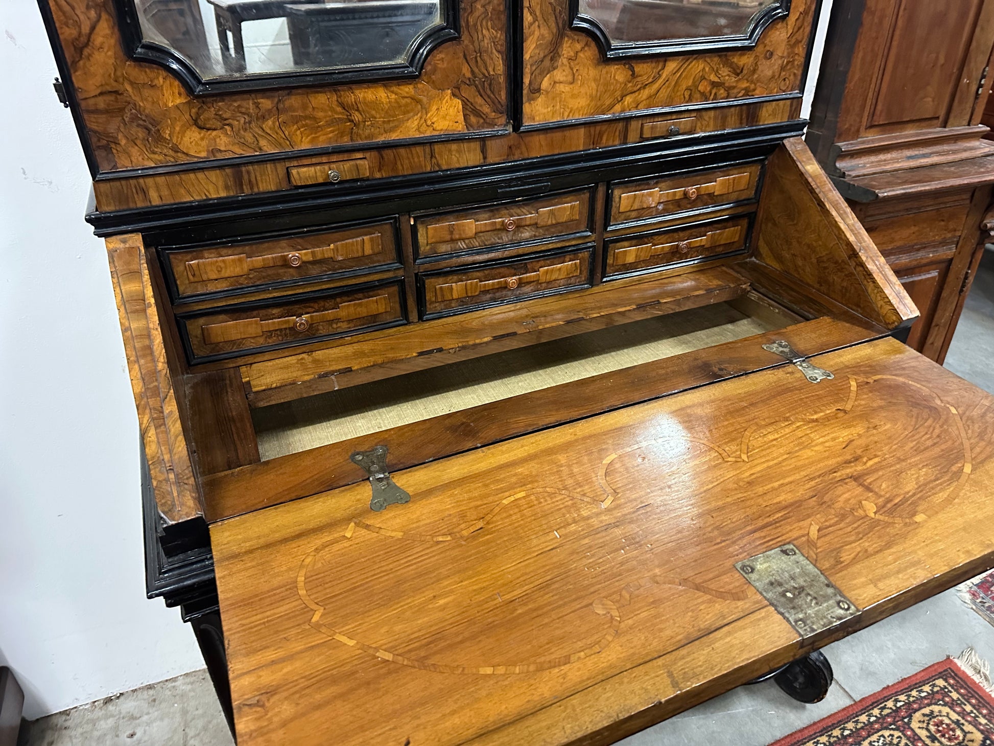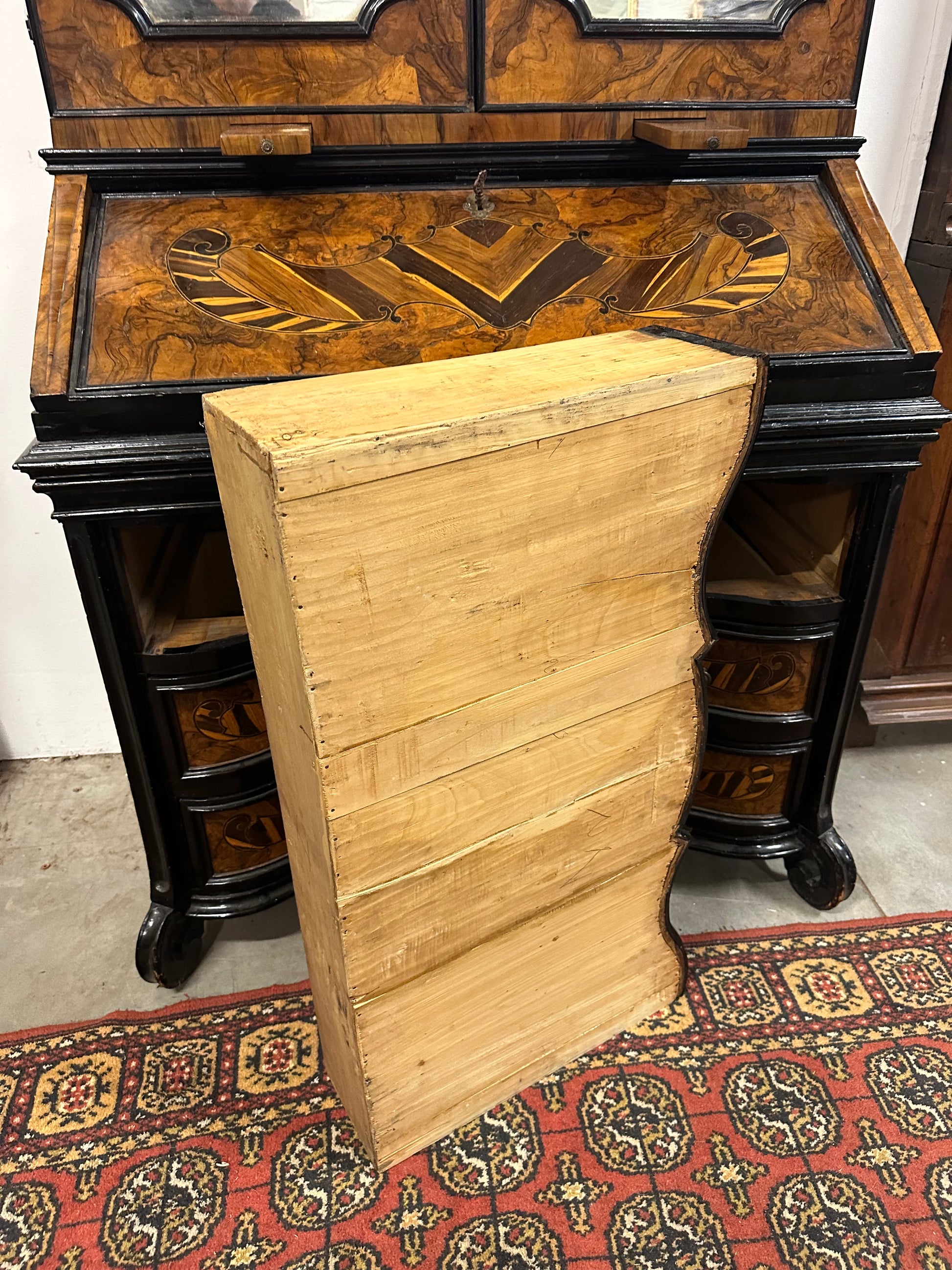 Importante trumeau lombardo luigi xv epoca primi anni del 700 sagomato sul fronte tutto lastronato in noce e radica di noce con cornici mistilinee ebanizzate , vetri al mercurio ,sei cassettini interni nello scarabattolo piedi a ricciolo coevi del periodo