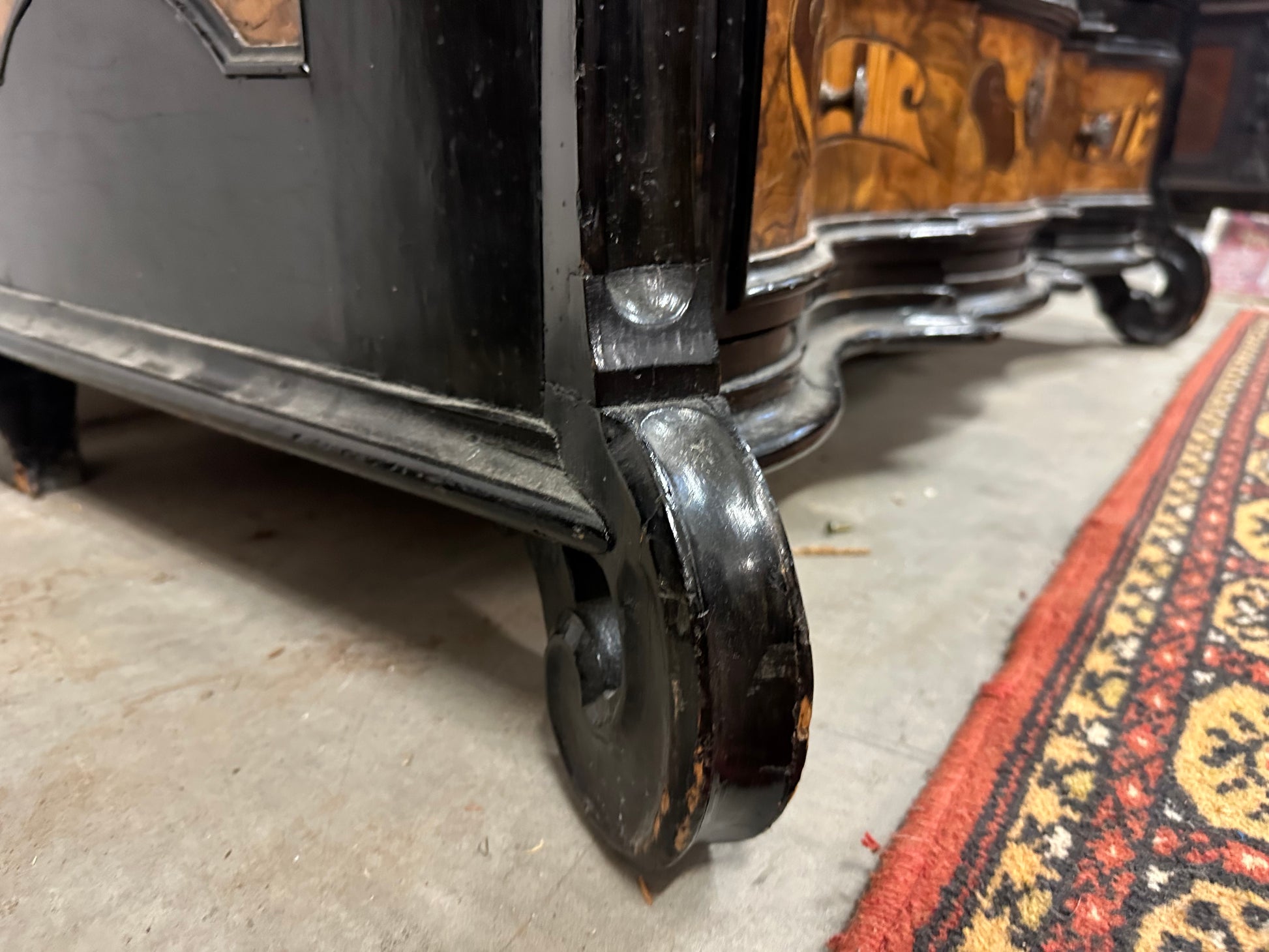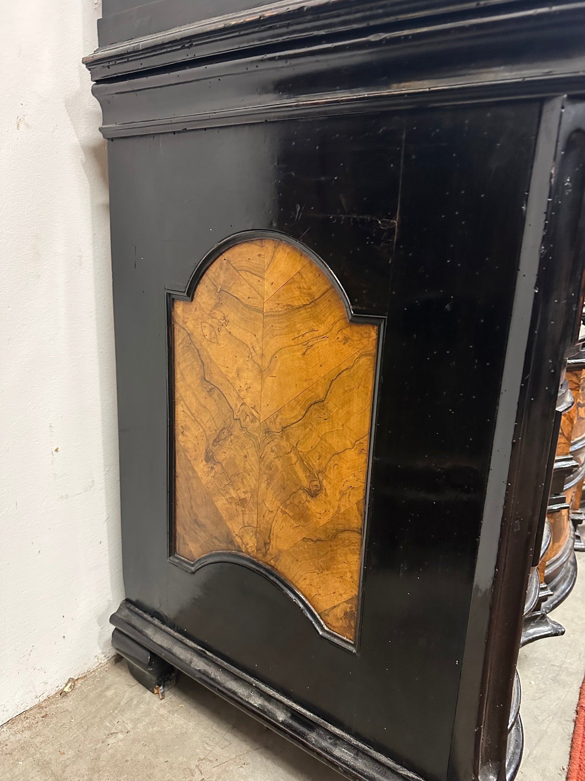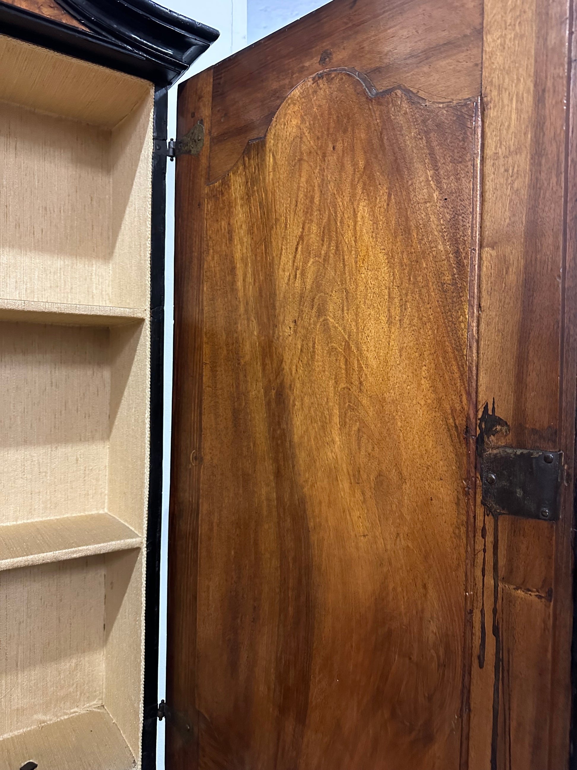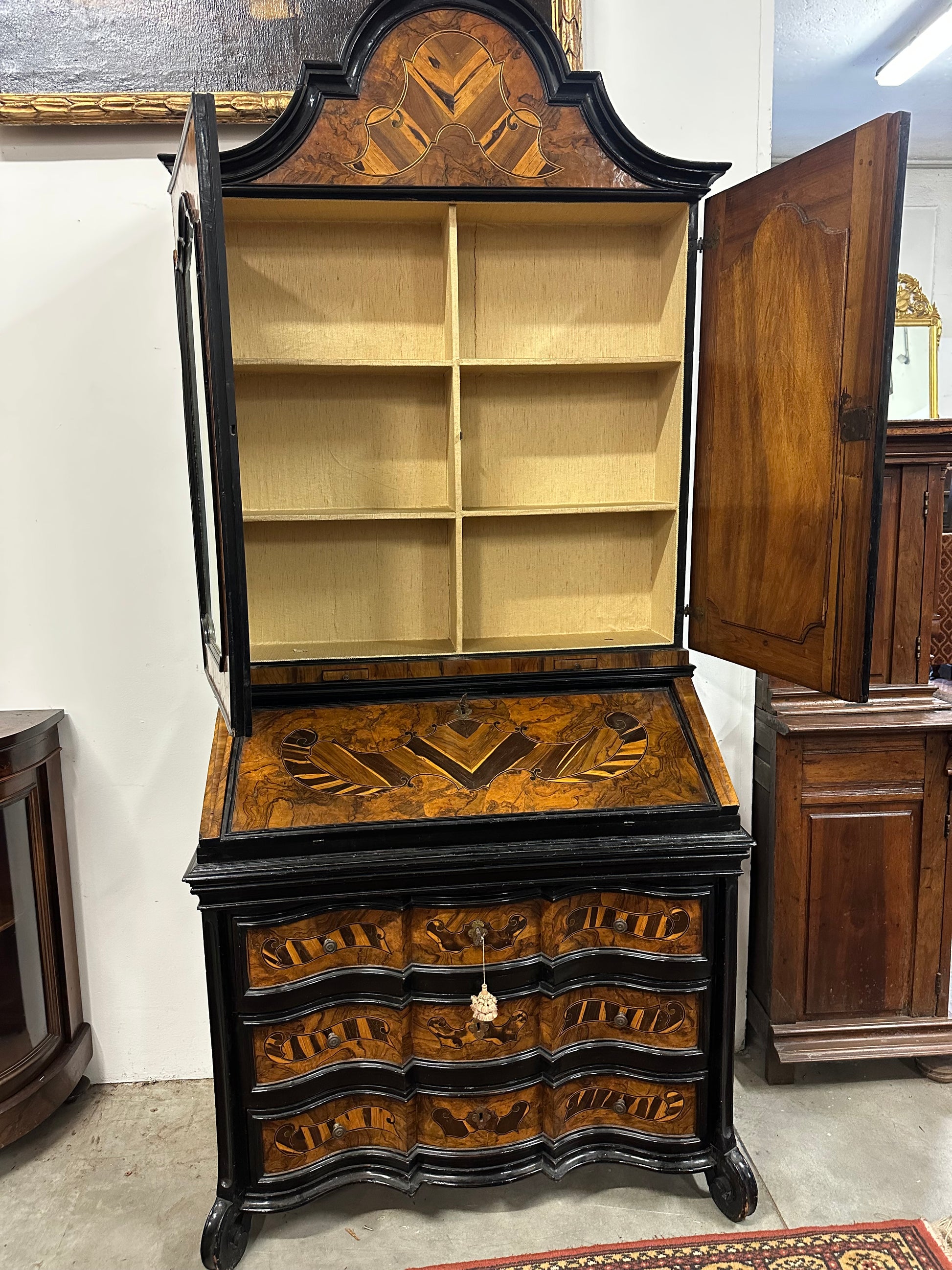 Importante trumeau lombardo luigi xv epoca primi anni del 700 sagomato sul fronte tutto lastronato in noce e radica di noce con cornici mistilinee ebanizzate , vetri al mercurio ,sei cassettini interni nello scarabattolo piedi a ricciolo coevi del periodo